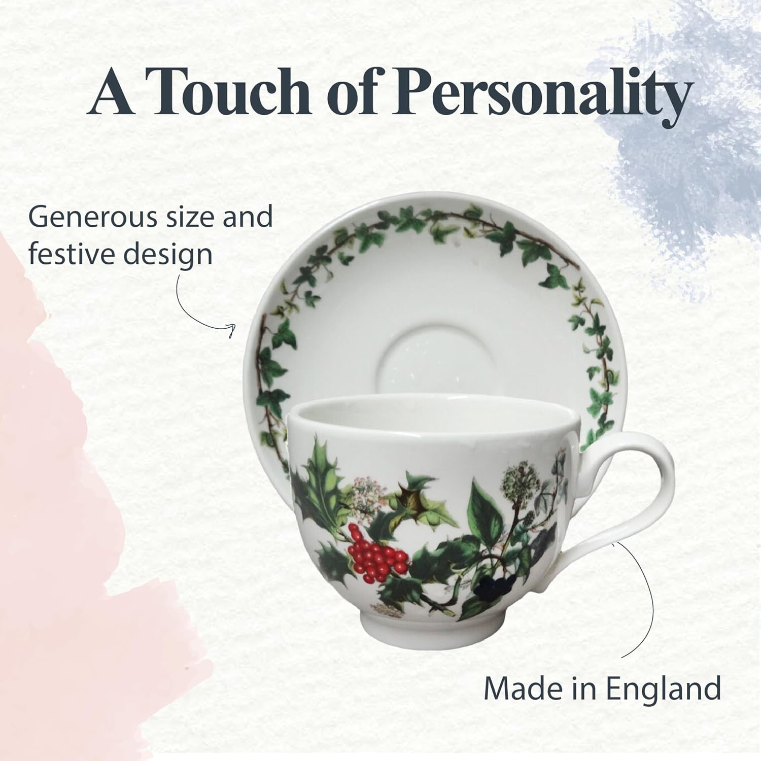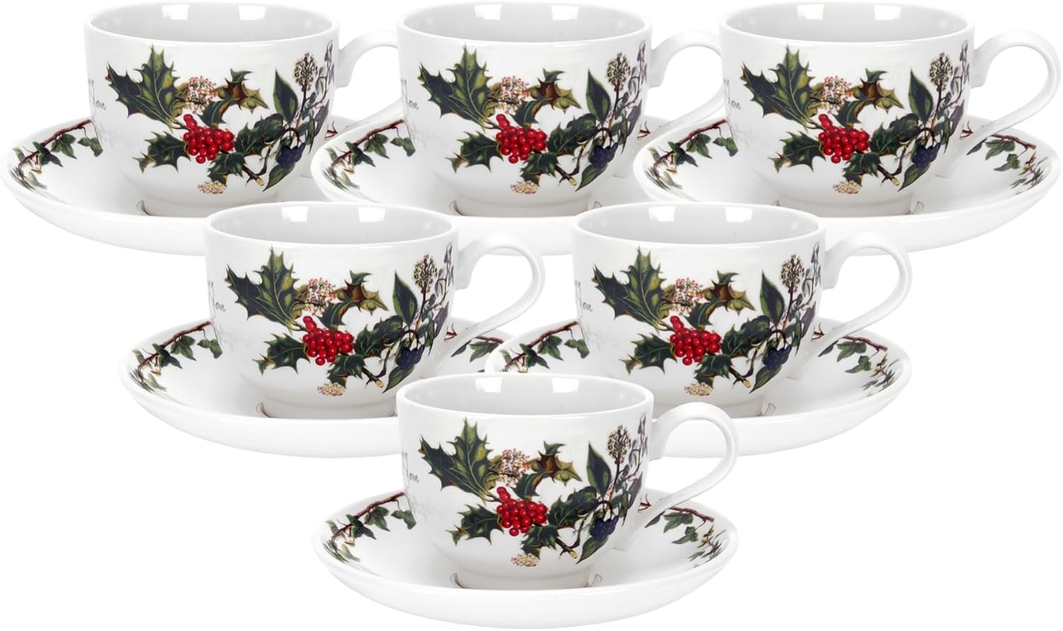 • Classic Holiday Design: Celebrate the season with this set of six teacups and saucers, each featuring the timeless 'the Holly and the Ivy' design. The vibrant green foliage and red berries bring a traditional Christmas feel to your table.