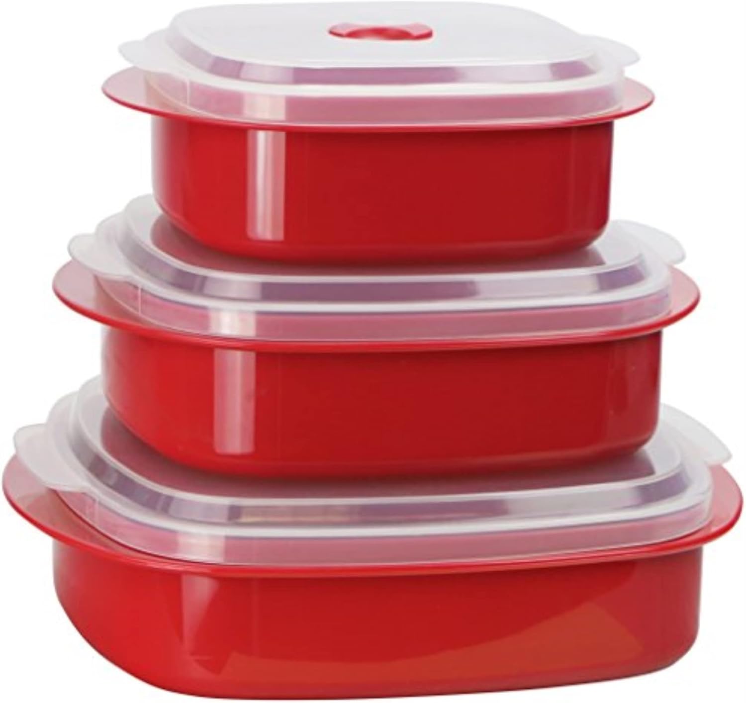 Reston Lloyd Nesting Microwave Containers, Set of 3, Adjustable Steam Vents, Airtight, Meal Prep, Durable BPA-Free Plastic- Freezer & Dishwasher Safe, Cookware & Food Storage, Anyday Cookware, Red