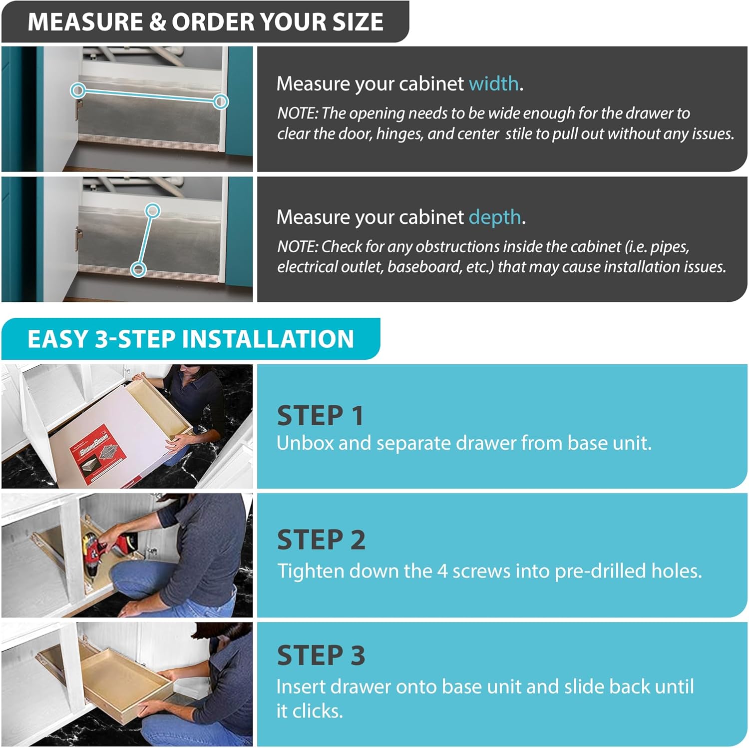 • MEASURING & SELECTION: Be sure to account for doors, hinges, stiles, outlets, pipes, and baseboards while measuring width and depth; Select the correct drawer size, listed as WIDTH x DEPTH x HEIGHT