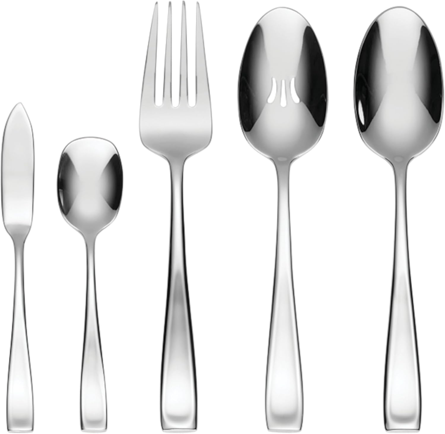 • WHAT'S IN THE BOX: Includes a 65-piece flatware set for 12 people, plus a 5-piece serving set. Each of the 12 flatware place settings includes a dinner fork, salad fork, dinner knife, dinner spoon, and teaspoon. Serving set includes a serving spoon, pierced serving spoon, sugar spoon, butter knife, and serving fork.