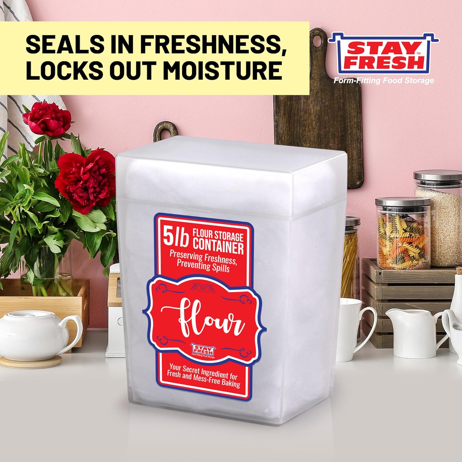 Stay Fresh Clear Flour Storage Container - Plastic Flour Canister for Kitchen Pantry, Baking Needs - Holds 5LB - Large Form - Fitting Food Keeper Bin
