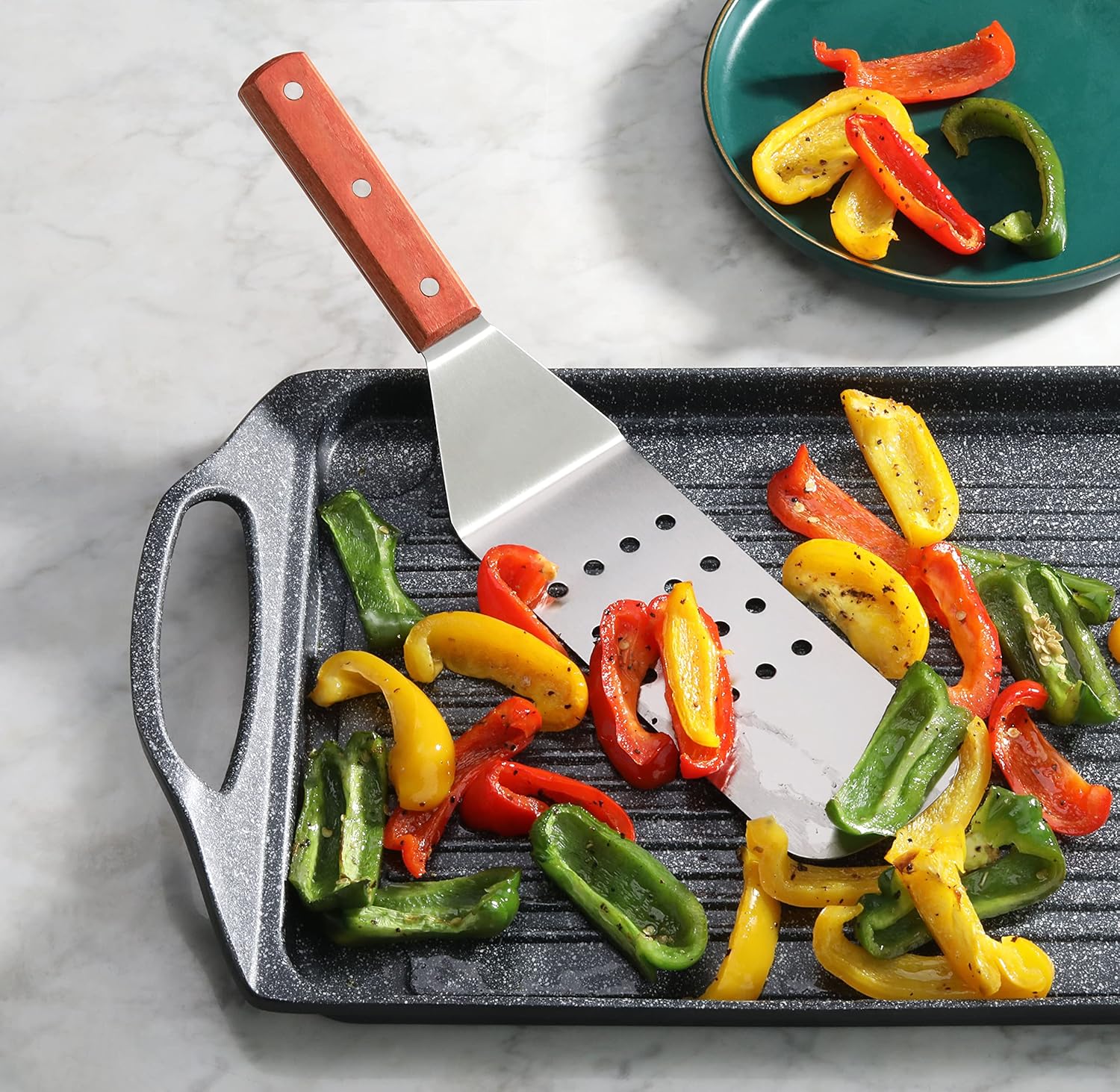 • Exceptionally well crafted solid and perforated turner set|Commercial quality can be used In restaurants food shops catering halls Etc.|Stainless steel blade with wooden handle securely riveted|Easy to clean and hand wash
