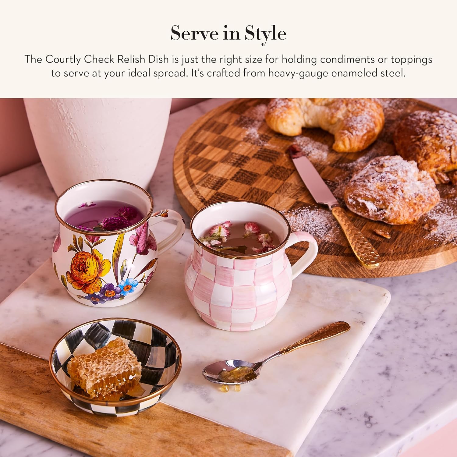 MACKENZIE-CHILDS Enamel Relish Dish, Small Serving Bowl for Entertaining, Black-and-White Courtly Check