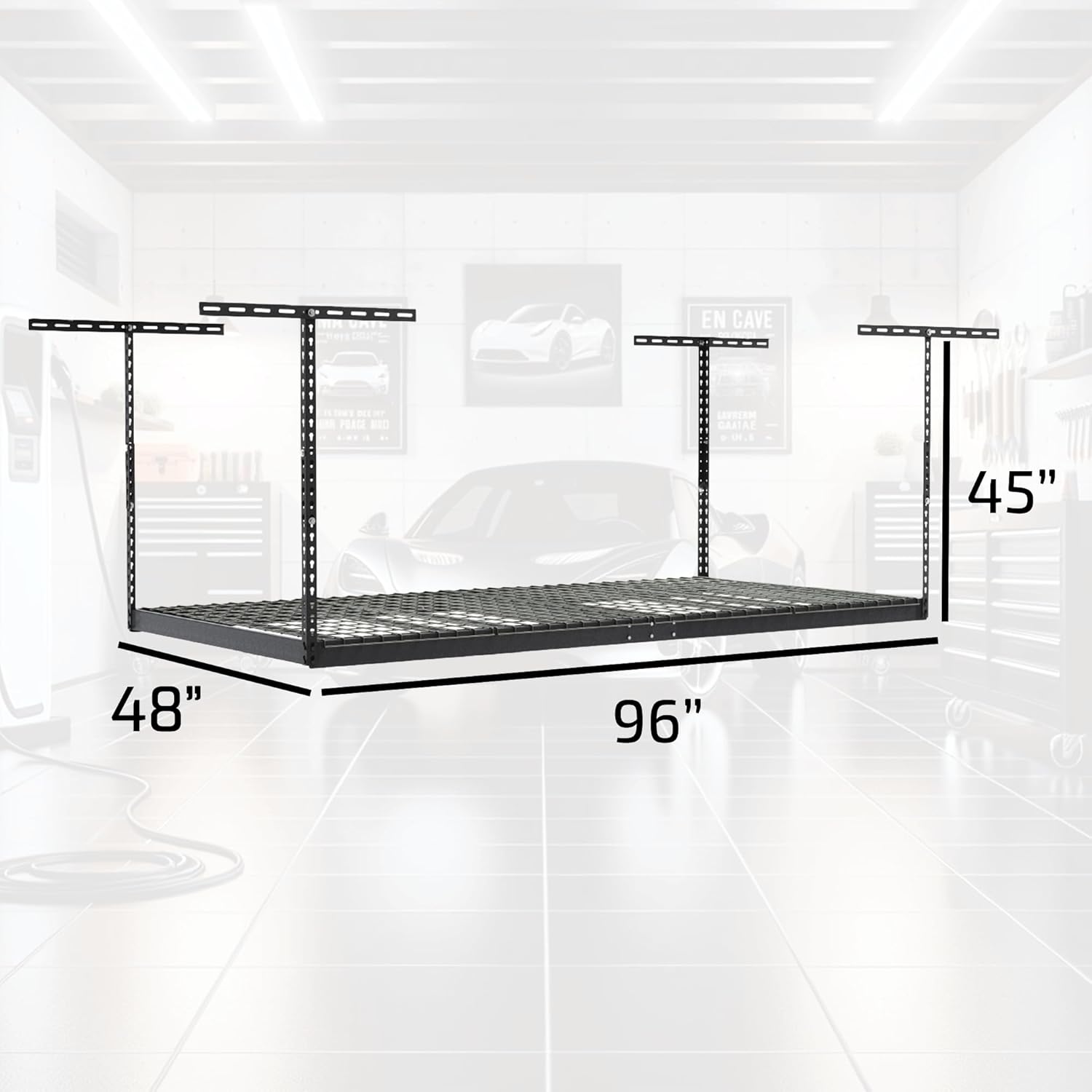 • MORE STORAGE, LESS CLUTTER: Designed with your storage needs in mind, ceiling mounted overhead garage storage helps you get organized by getting your things off the floor and out of the way saving valuable space in your garage. This hanging storage system is a great space saver; allowing you to utilize previously unused space providing you more storage and better organization.