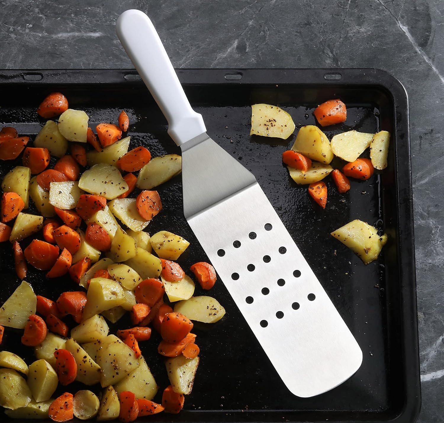 • Exceptionally well crafted solid and perforated turner set|Commercial quality can be used In restaurants food shops catering halls Etc.|Stainless steel blade with wooden handle securely riveted|Easy to clean and hand wash
