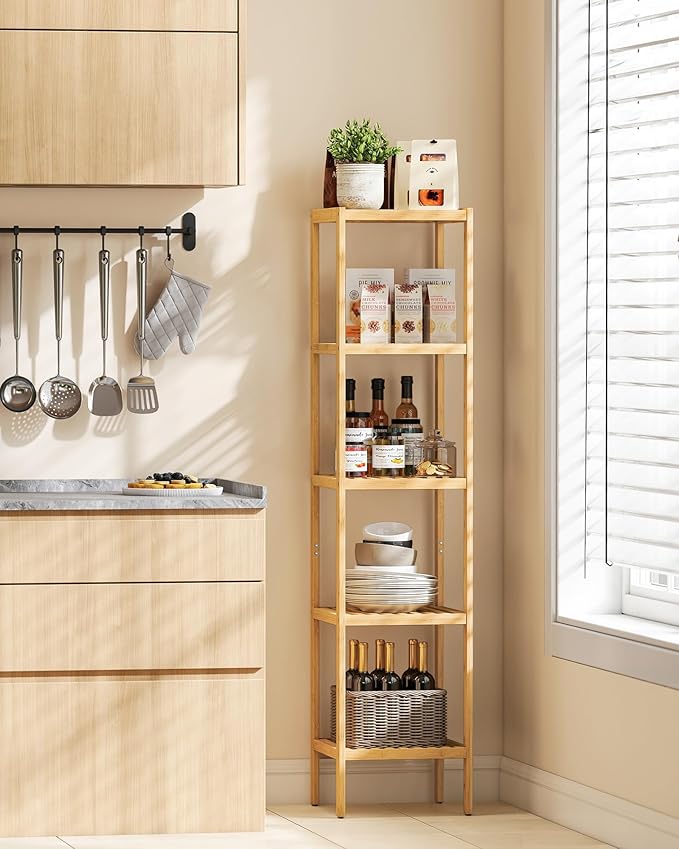 SONGMICS Bamboo Storage Shelf, 5-Tier Shelving Unit, Multifunctional, in the Entryway, Bathroom, Living Room, Balcony, Kitchen, 13 x 13 x 57.5 Inches, Light Bamboo UBCB55Y