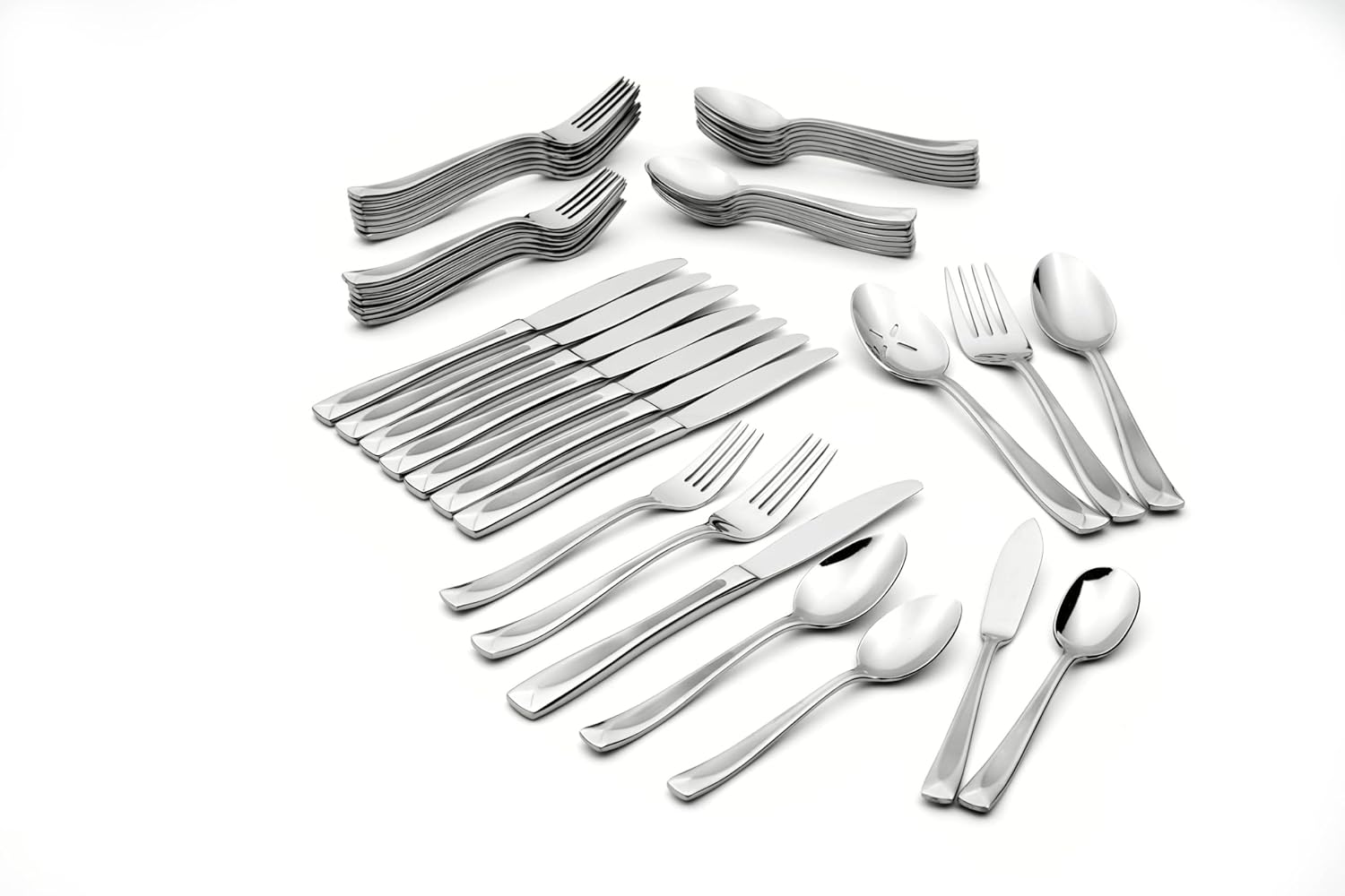 • INCLUDES: This Oneida silverware set contains (8) Dinner Knives, (8) Dinner Forks, (8) Salad Forks, (8) Dinner Spoons and (8) Teaspoons, (1) Serving Spoon, (1) Pierced Serving Spoon, (1) Sugar Spoon, (1) Butter Knife and (1) Serving Fork.