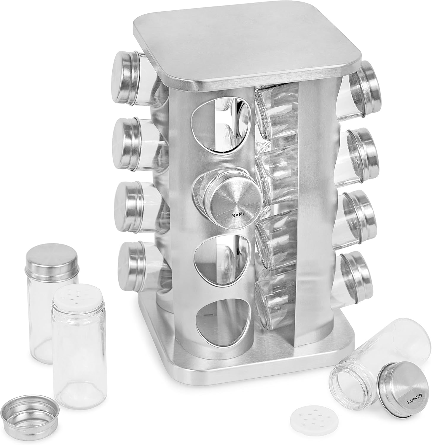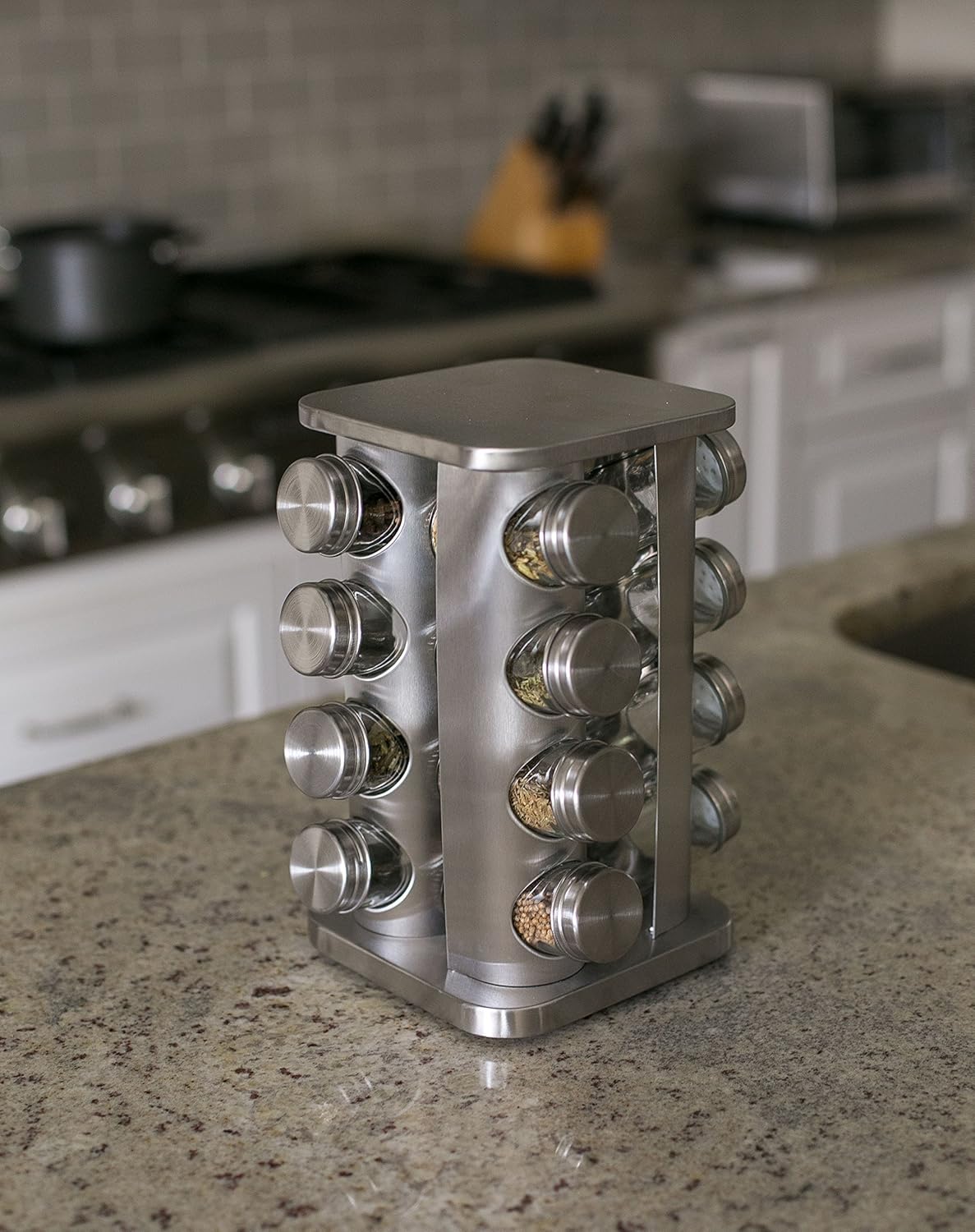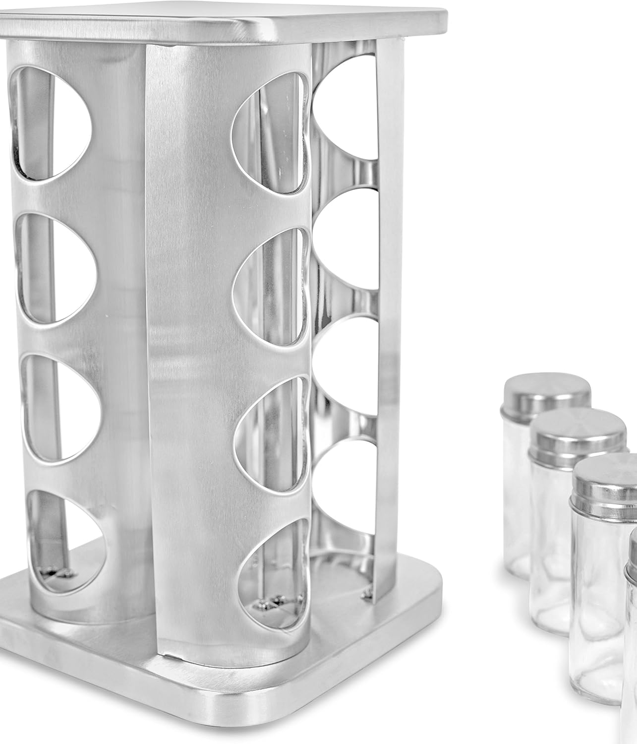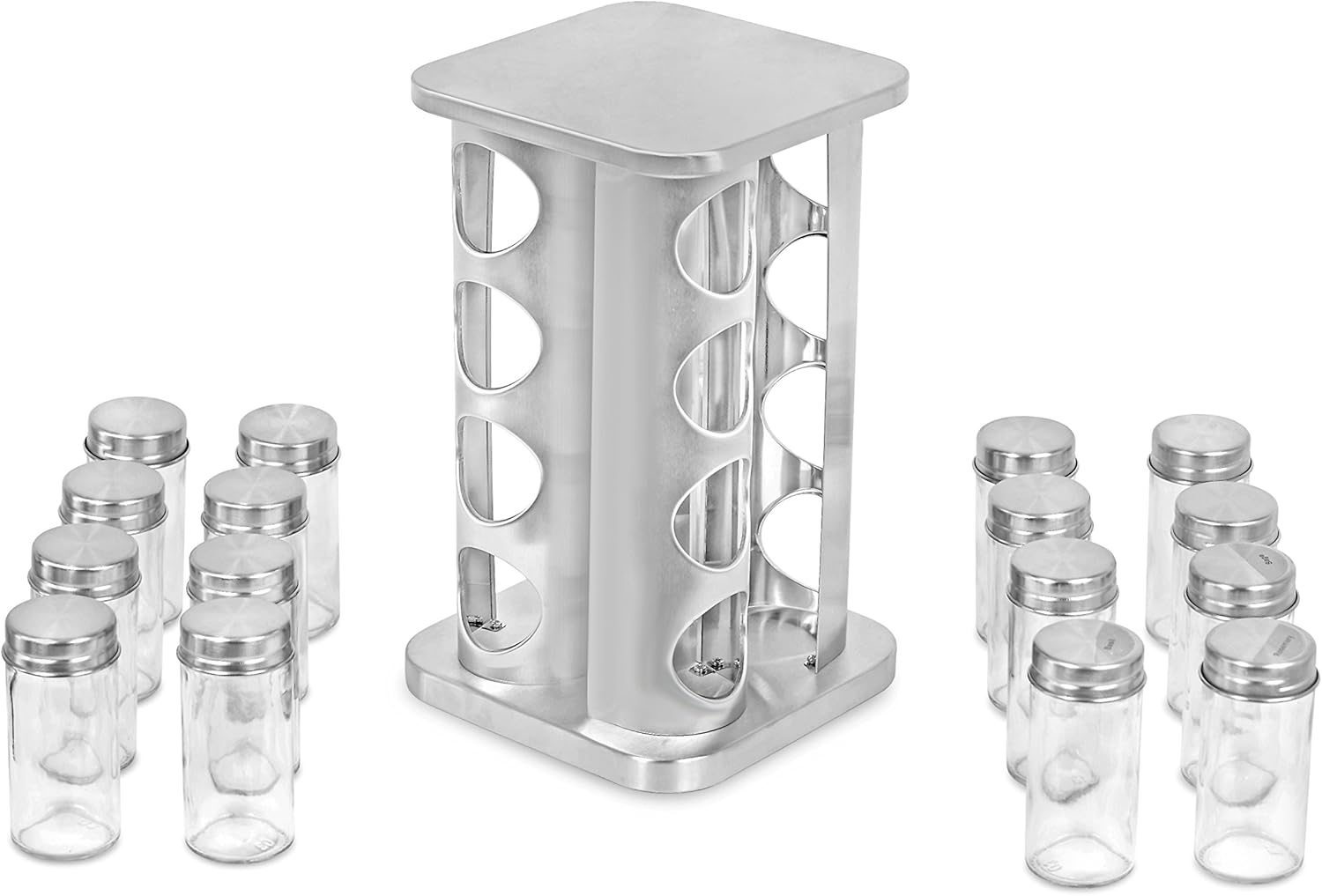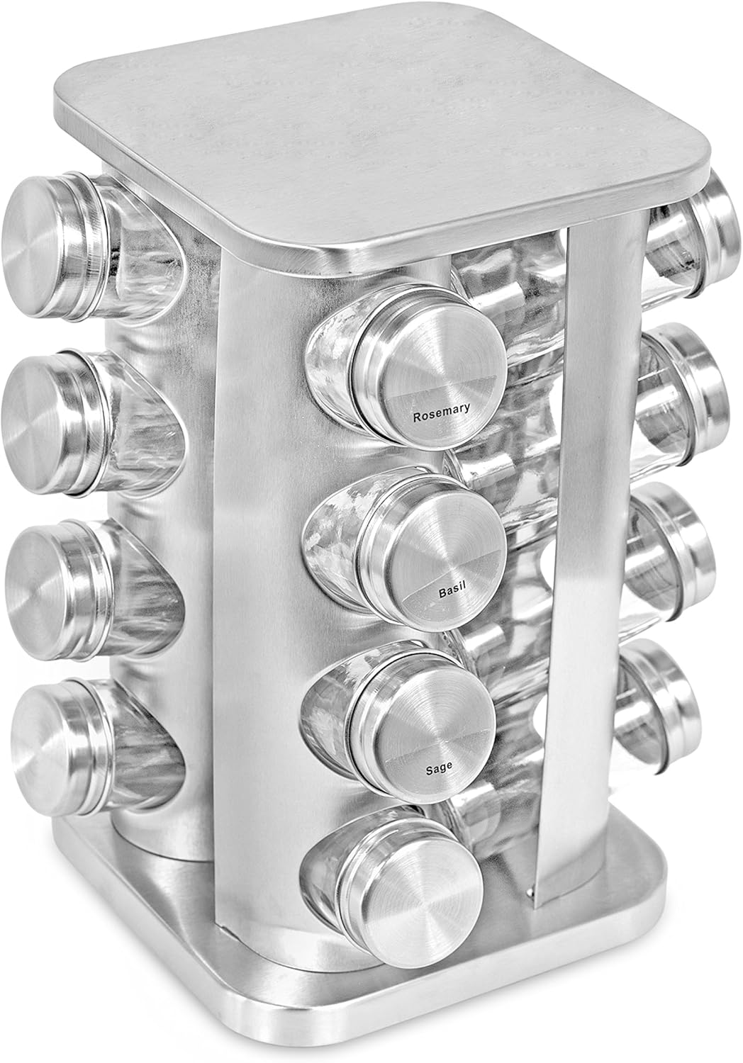 • COMPACT AND FUNCTIONAL DESIGN: This set includes a compact stainless steel spinning tower with 16 glass jars, each pre-labeled for easy identification. The tower measures 7.5" W x 11" H x 7.5" D, making it an ideal fit for kitchen countertops.