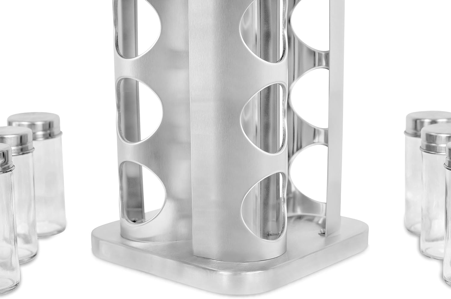 • SMOOTH ROTATING DESIGN: The revolving tower allows easy access to all 16 jars, making it simple to find the seasoning you need. The stainless steel structure is designed to fit well on your kitchen countertop, offering both functionality and a modern look.