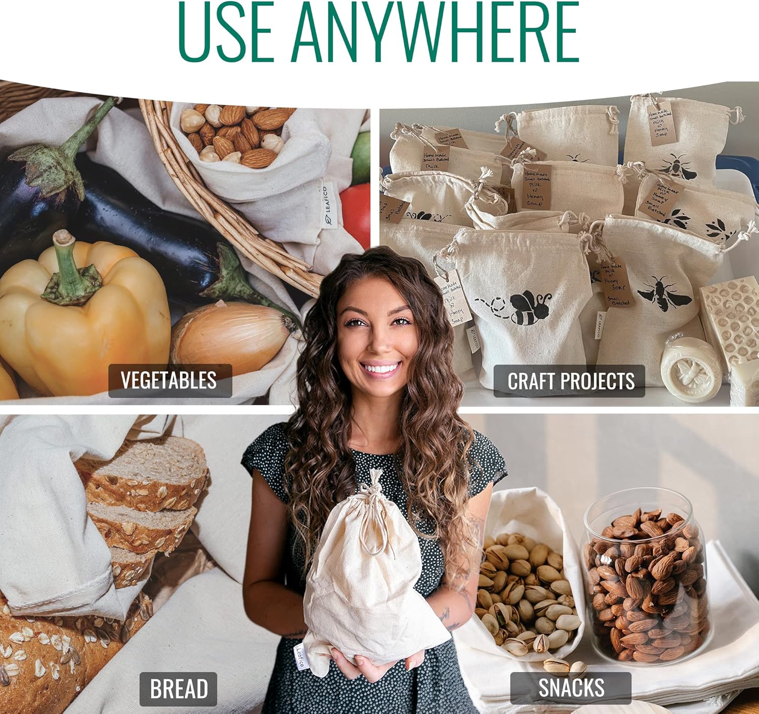 • Reusable and Machine-Washable Cotton Fabric - Leafico muslin cloth bags are 100% natural cotton and machine washable (wash with cold water and air dry). We give you more with extra material on the sides so our cotton fabric bags are truly the size we say.