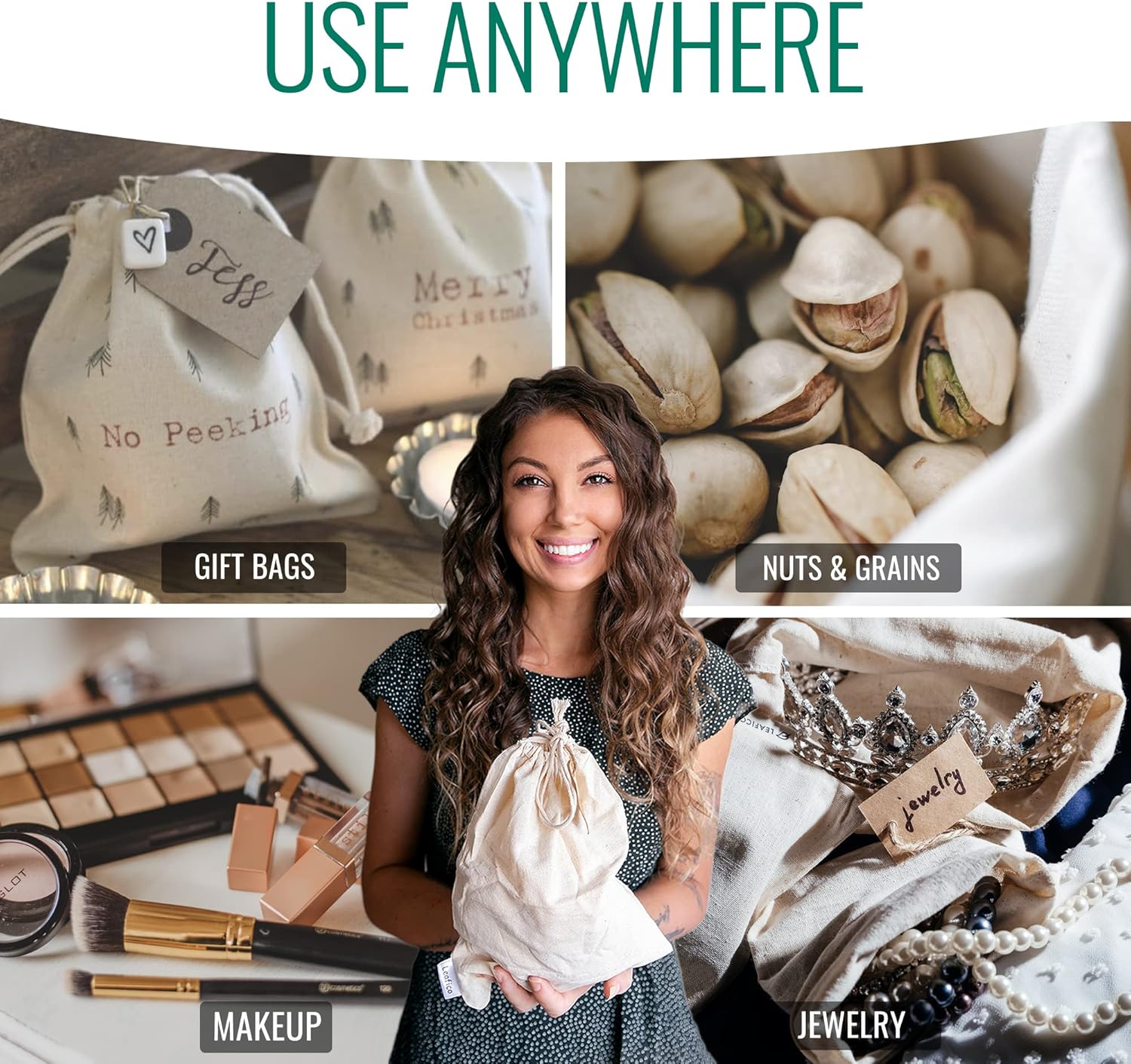 • Multipurpose Zero Waste Cloth Bags - Designed with everyday use in mind, our reusable cotton grocery bags are great bulk bin bags for toy storage, sachet bags, beach bags, and storing jewelry bags. Can also be used for culinary purposes like storing herbs or spices or straining yogurt like cheese cloth, juice, nut milk bags
