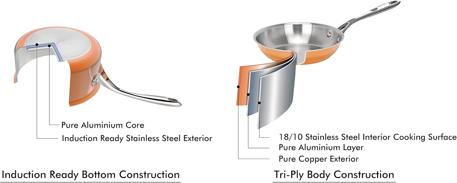 • All bodies and lids are constructured from Tri-Ply: Pure copper + Pure Aluminum + S/S 18/10 for ideal cooking results.