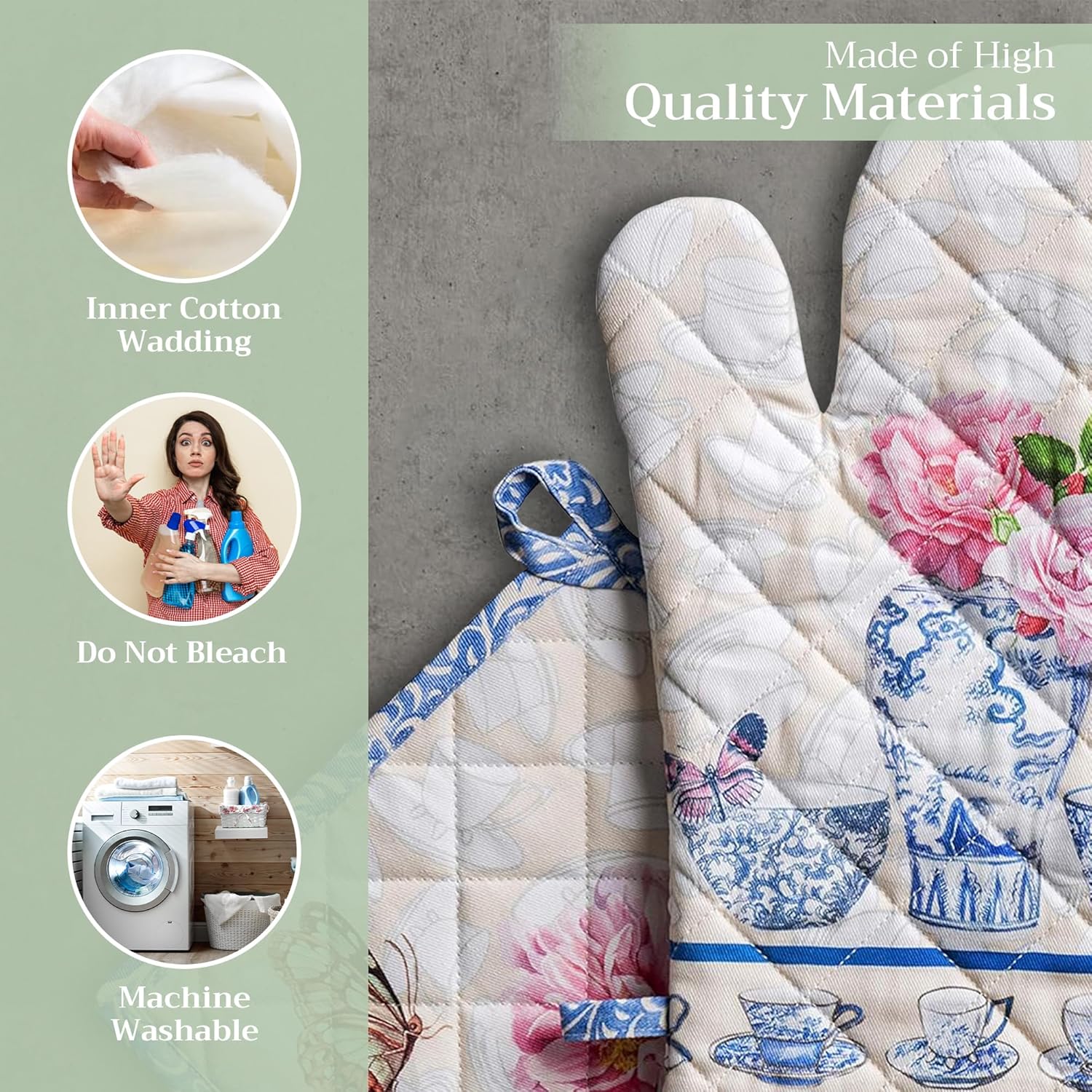 • Artistic style: Add charm to your kitchen with our oven mitt pot holder set featuring watercolor designs inspired by traditional European motifs. Stylish and functional kitchen accessories for every home cook or gift occasion.