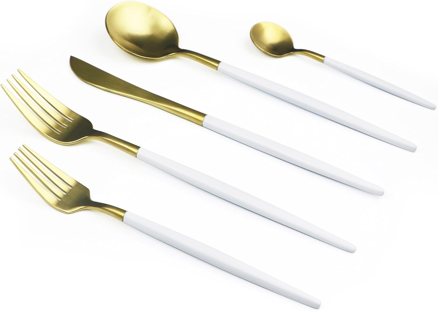 20-Piece 18/10 Stainless Steel Flatware Set, Serive for 4, With Fork Spoons Knife Teaspoon Dessert Fork for Home Kitchen Restaurant Hotel (White + Gold)