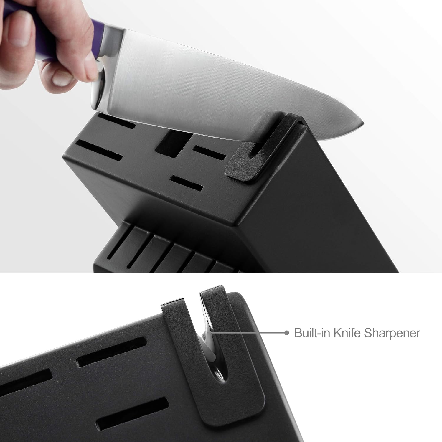 • Exclusive Built in Sharpner- Stainless steel knife block set with built-in sharpener is amazing. It saves you from having to honing blades on a sharpening steel.