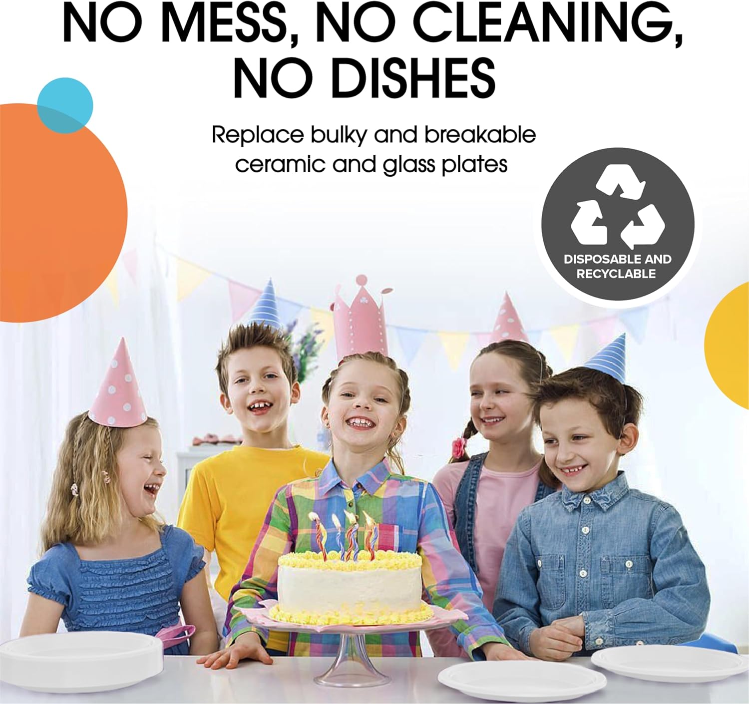 • Health & Safety: Our white plastic plate set is made with food-safe materials, ensuring the health and safety of your guests. Whether it's for a birthday party or a picnic, you can trust that these disposable plastic plates meet the highest standards of hygiene, providing peace of mind for you and your loved ones.