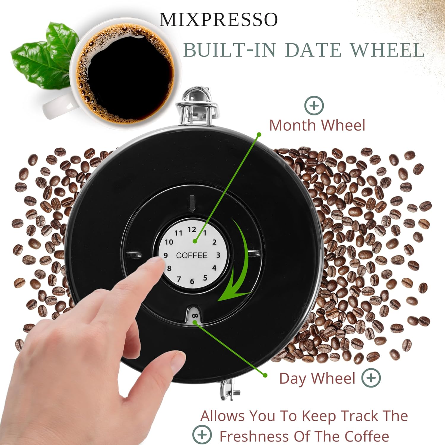 • Storage Space with Date Tracker: This airtight container holds up to 16 oz (approx. 450g) of coffee or ground coffee. Built-in lid date wheel helps track freshness, storage time and preserve flavor.