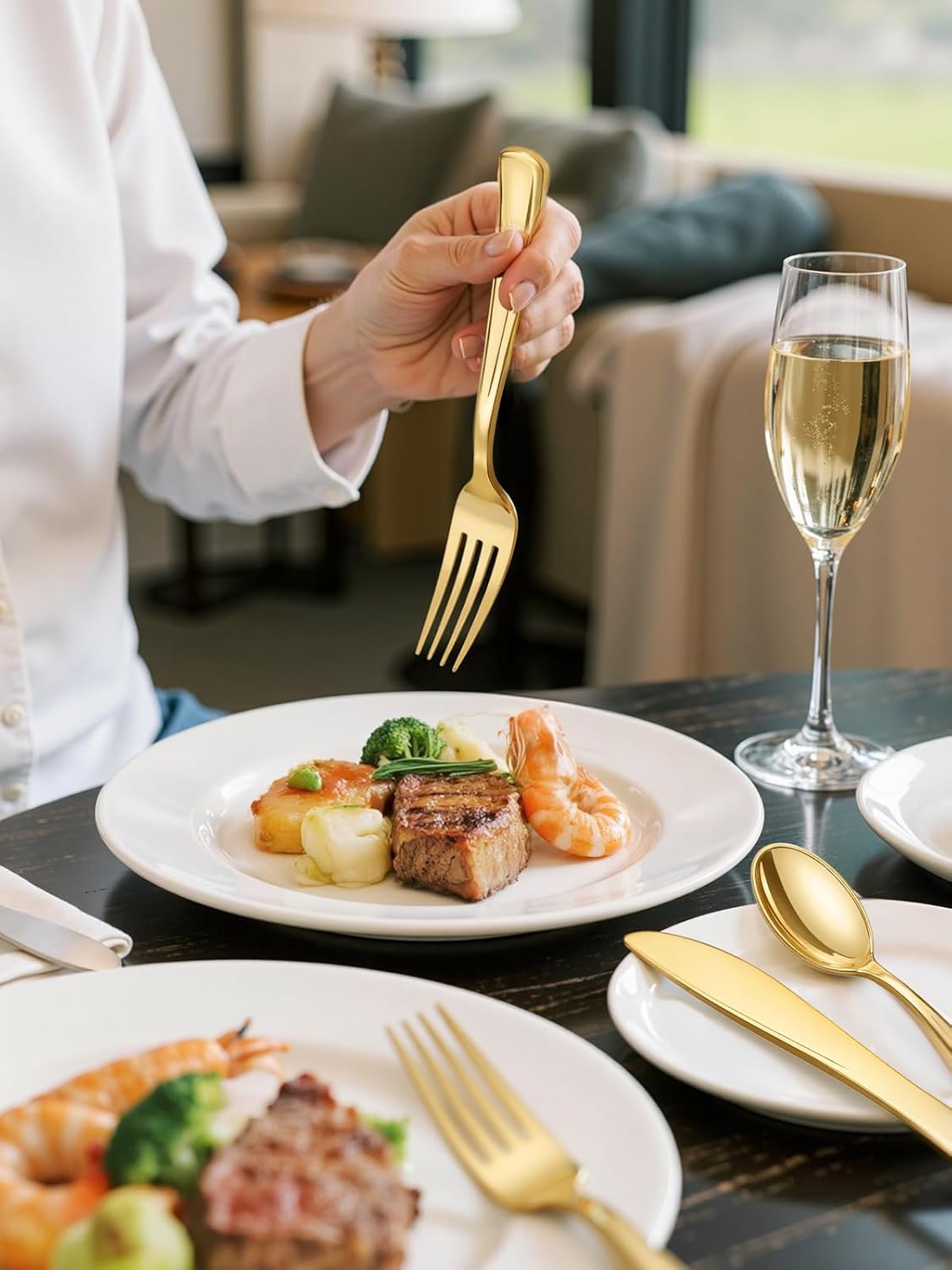 • AUTHENTIC LOOK AND FEEL: We sourced the gold utensils set disposable that shines and shimmers like real gold. The heavyweight durable design prevents breakage and can stand up to manual washing for reuse.