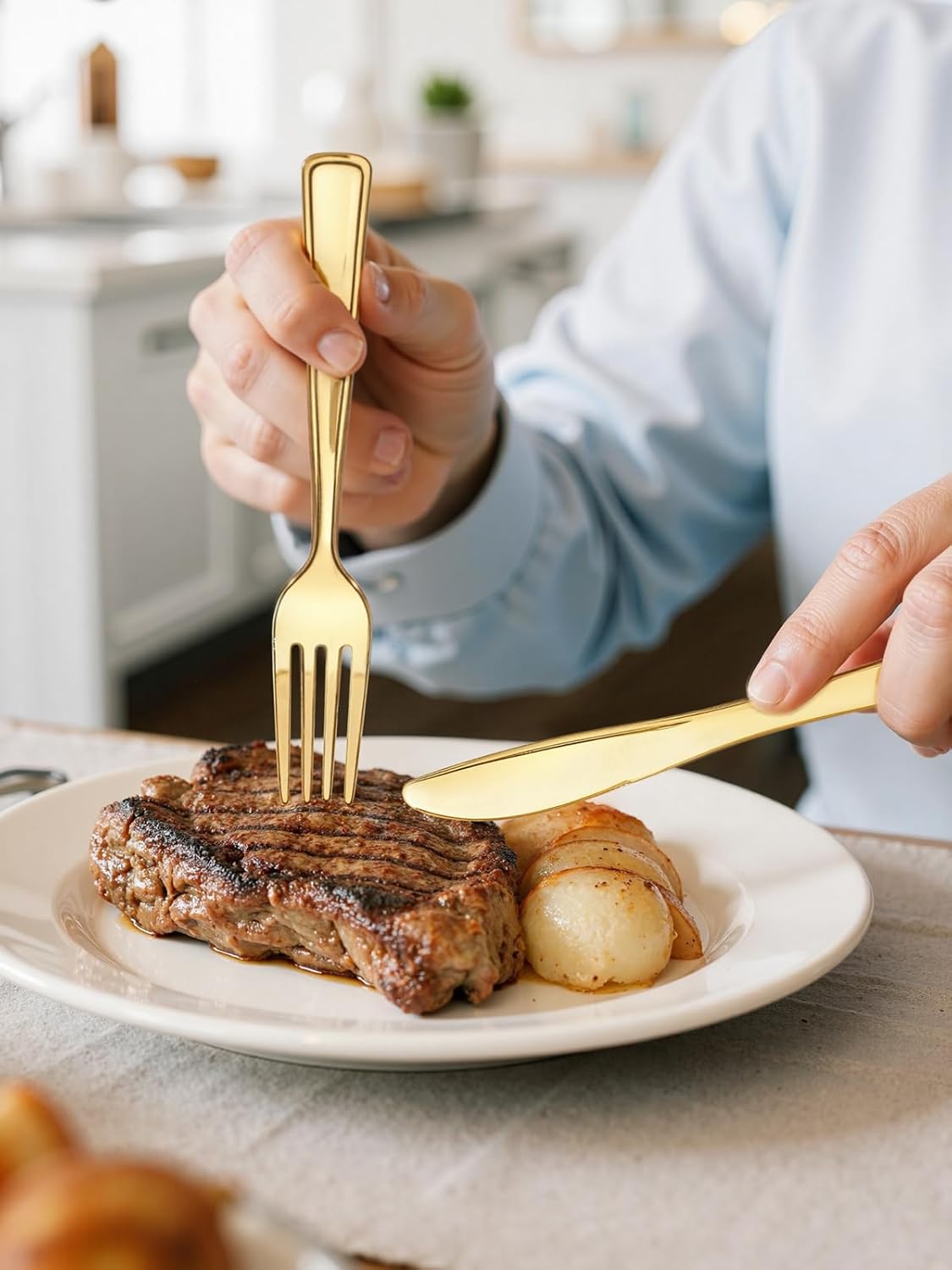 • SUITABLE FOR ADULT: These gold disposable silverware perfect size of them (fork 7.40in,knife 7.87in and spoon 6.89in.) ,It looks just like real gold. Make the length is enough for adult.