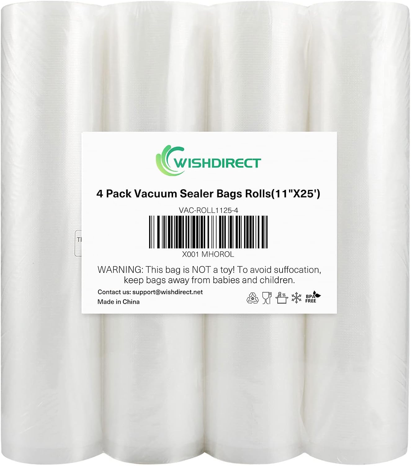 Vacuum Sealer Bags Rolls Compatible with FoodSaver 4-Pack 11" x 25' Vacuum Seal Rolls Fit Inside Machine Double-Side Embossed BPA-Free Bags for Sous Vide or Food Storage (Total 100 Feet)