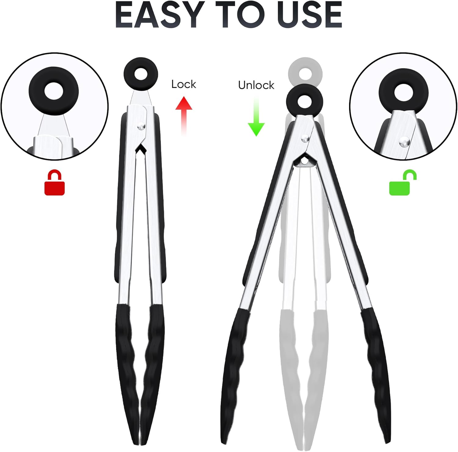 • Pull-Lock Mechanism for Easy Use: The pull-lock mechanism prevents these food tongs from opening accidentally, and locks them for easy storage.