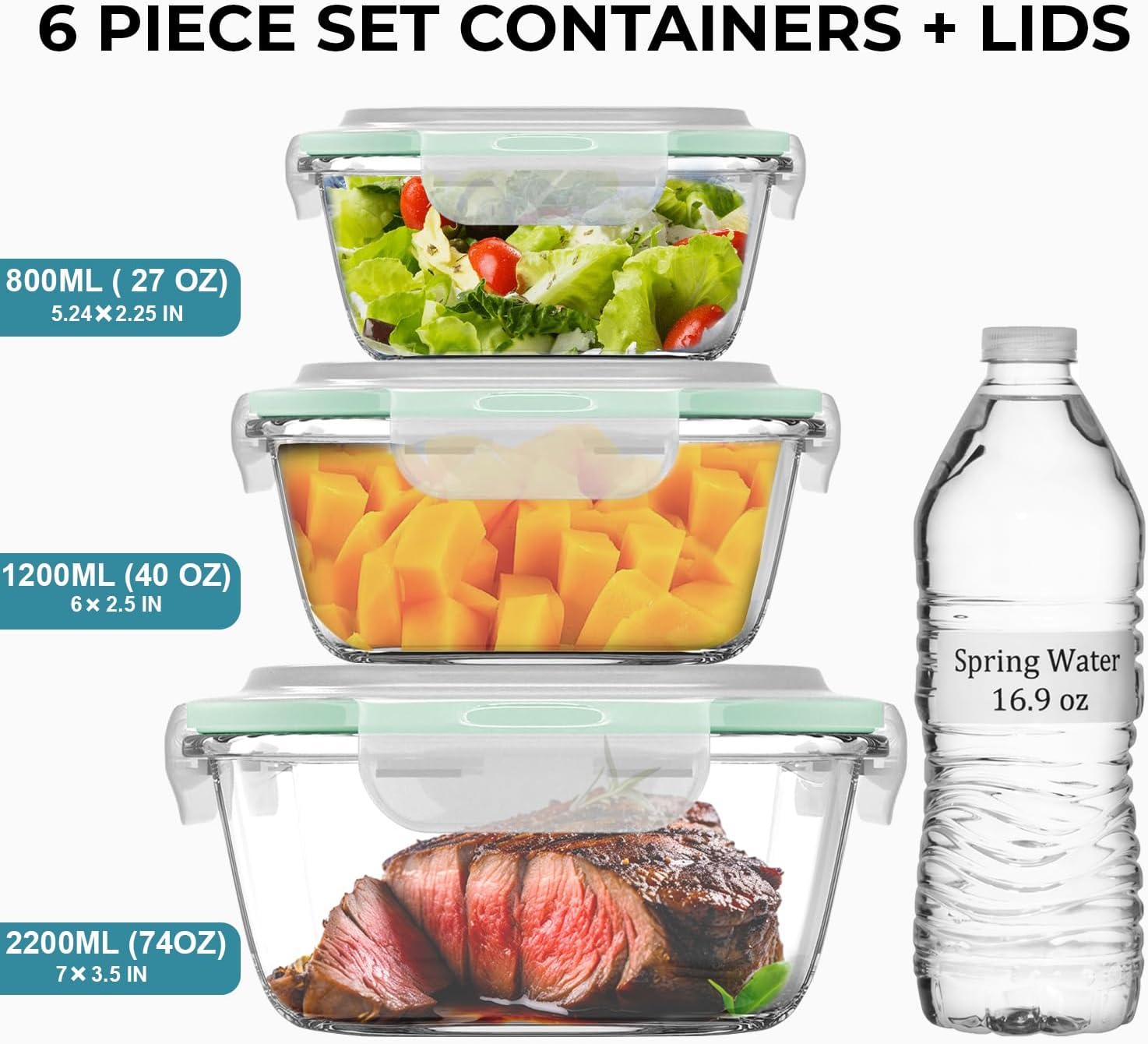 • Six piece square glass storage containers - Razab set of three large glass food storage containers with lids includes a variety of sizes 2200ml (74 oz), 1200ml (40 oz), and 800ml (27 oz) square glass containers with snap-locking lids. Whether it’s meal prep, lunch, or leftovers, this container set has you covered.