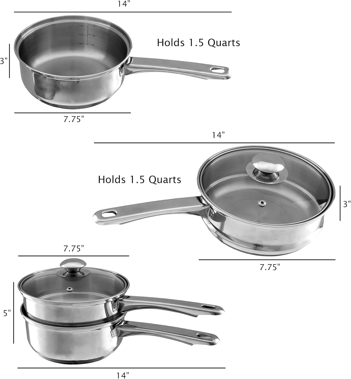 • PRODUCT DETAILS - Materials: Stainless-Steel and Tempered Glass. Dimensions: 3" (H) x 7.75" Diameter, 1.5 Quart Capacity (Bottom Pot). 3" (H) x 7.75" Diameter, 6 Cup Capacity (Top Pot). Includes bottom saucepan, top pot, and lid.