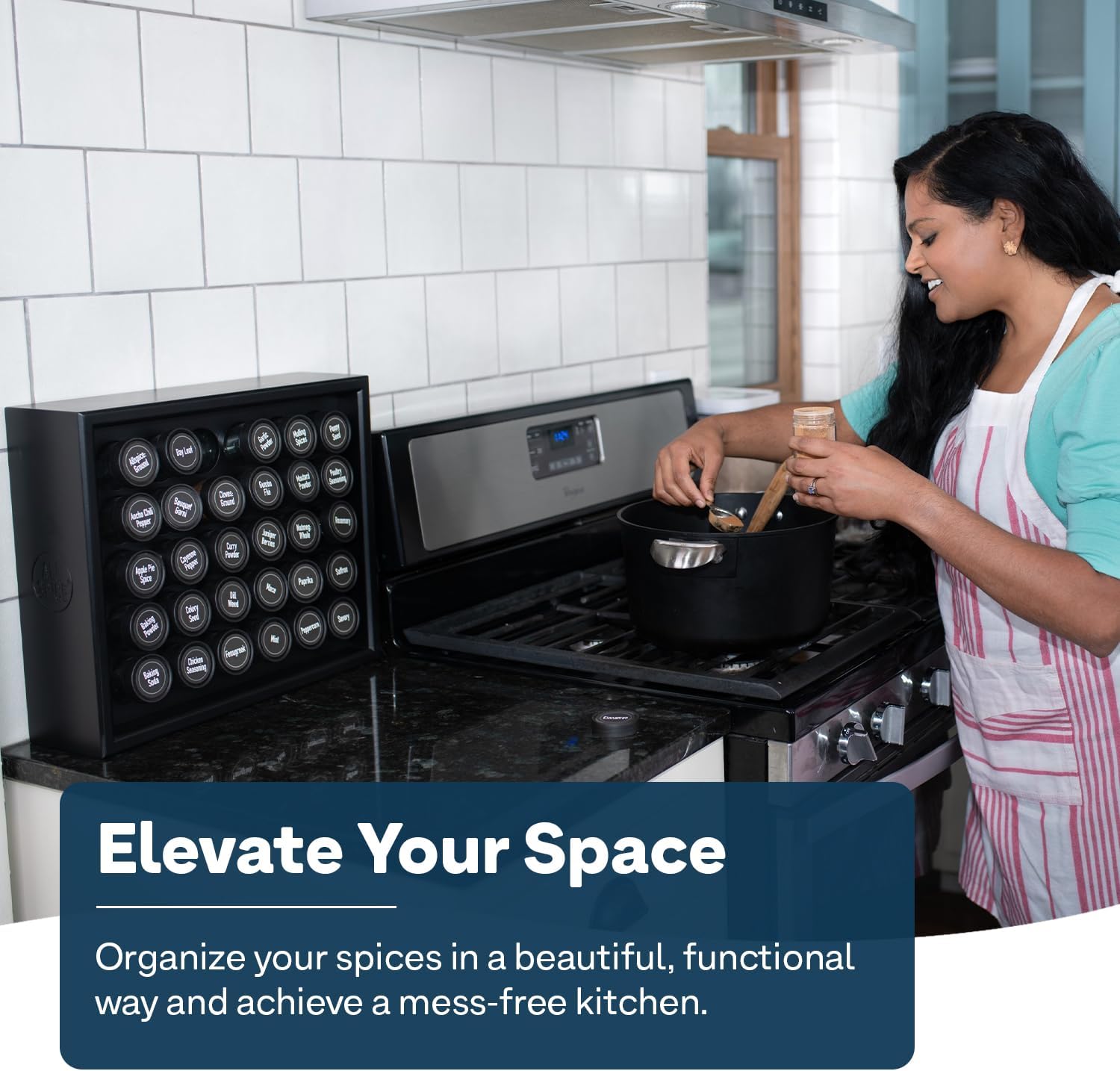 • Solid Bamboo Wood - Crafted with a durable bamboo frame and painted with a sleek matte black finish, the All Spice organizer infuses style to any kitchen or pantry décor while eliminating cluttered countertops, cabinets and seasoning containers