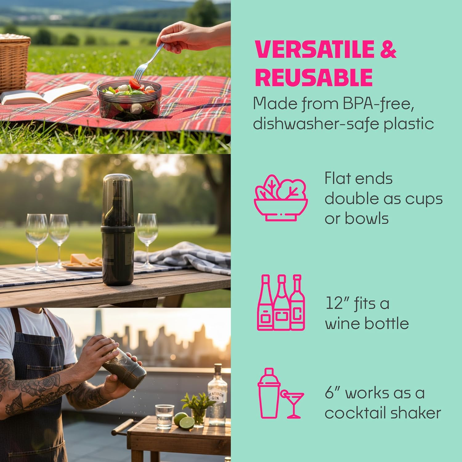 • Versatile & Reusable - Say goodbye to flimsy bags that leak and waste. The SubSafe container is made of BPA-free, dishwasher-safe plastic designed to last. Its flat ends double as cups or bowls, the 12” size safely carries a bottle of wine, and the 6” piece works perfectly as a cocktail shaker.