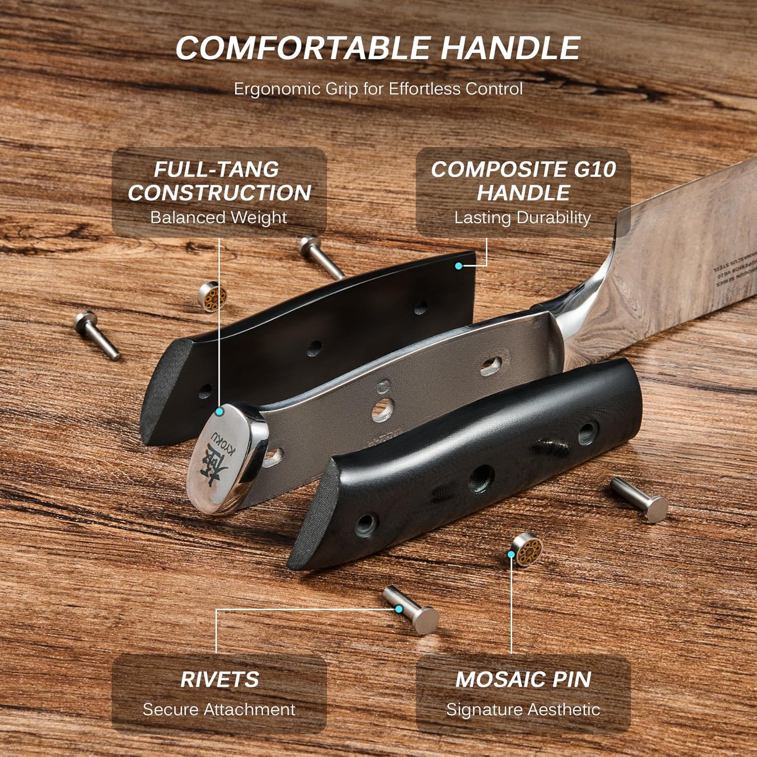 • 8" chef knife: This all-purpose knife is part of Kyoku, manufactured with modern technology and traditional craftsmanship; its Japanese 67 layer Damascus VG-10 steel blade has been cryogenically treated and paired with a perfectly balanced handle offering superior precision and control for home chefs and culinary professionals alike