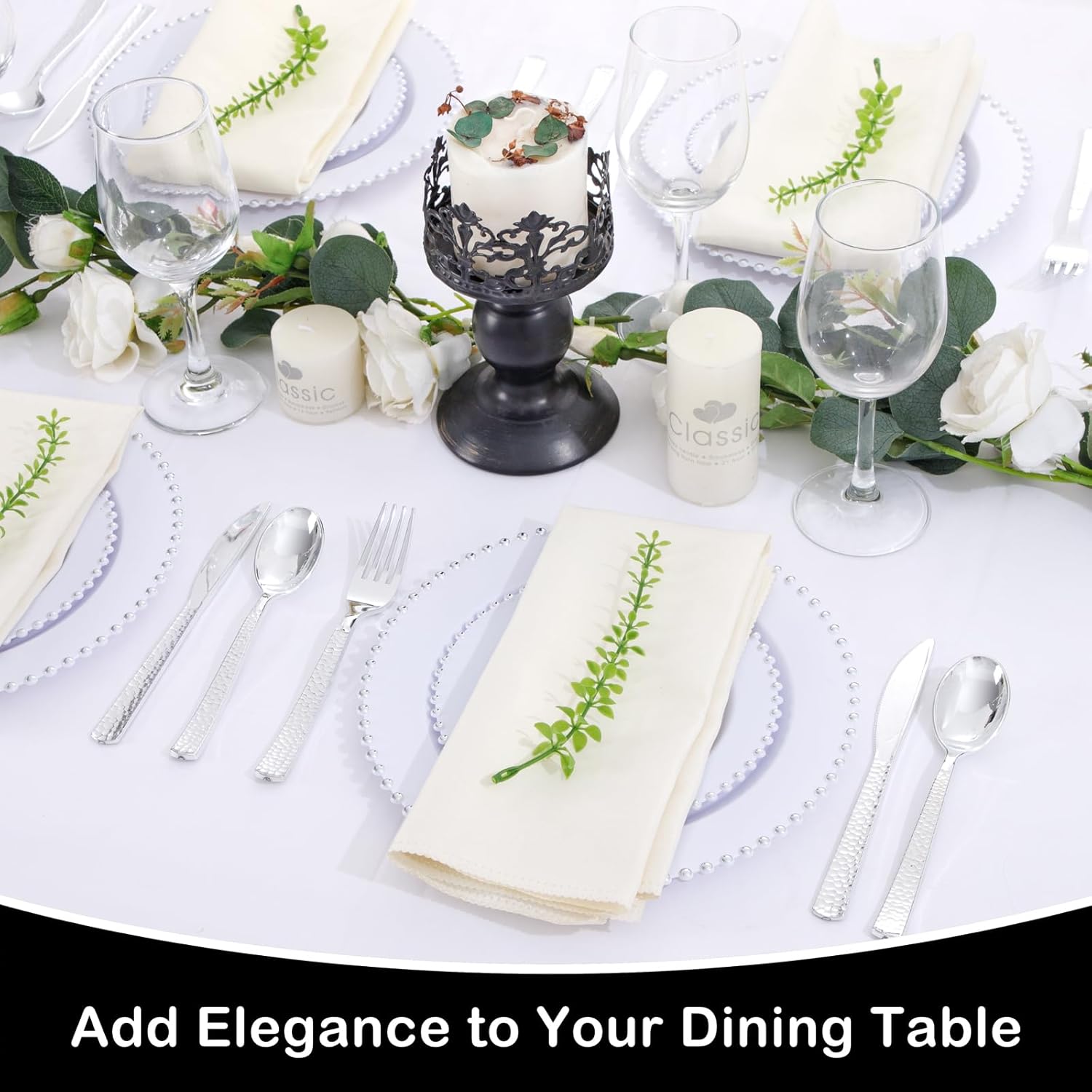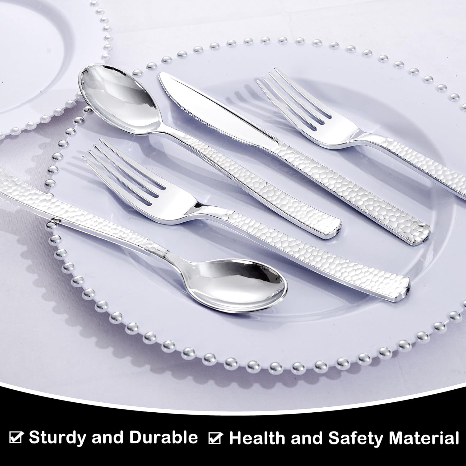 • Elegant and High-End Craftsmanship: The silver plastic cutlery have special hammered handle like the diamond which can suit for any occasions. Heavy-duty plastic silverware is strong and durable, and can resist the bending of steaks or cakes. The disposable cutlery is aluminum silver color which is much more shine and brightness with a brighter and more lustrous appearance.