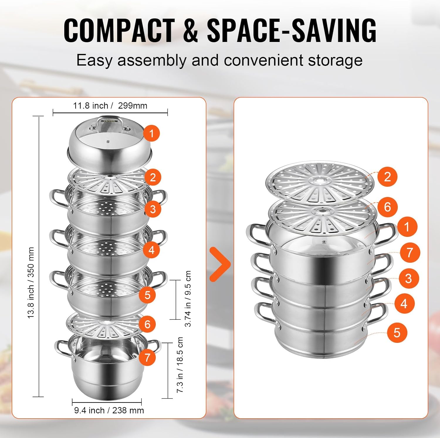 • Portable and Space-Saving: The VEVOR 5-tier stackable steamer cookware solves your storage problems and maximizes kitchen space utilization. It can be separated into individual pots (3 steamer pots, a stock pot, 2 steaming trays) that cater to your different cooking needs, flexible to steam and boil healthy and delicious meals whenever you want.