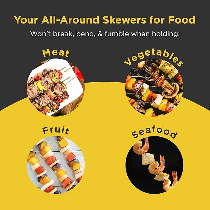 • FLAT METAL DESIGN FOR EVEN COOKING: Our flat barbecue skewers prevent food from rotating during grilling, ensuring each ingredient is evenly cooked. The angled sharp tip easily pierces through a variety of foods, including chicken, beef, seafood, and fruits, providing a smooth grilling process.