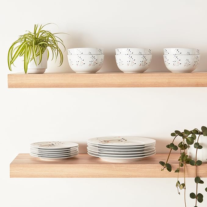 Amazon Basics Dinnerware Set, Microwave and Dishwasher Safe, Service for 6, 18-Piece Complete Kitchen, Plates, Dishes, Bowls, Branches