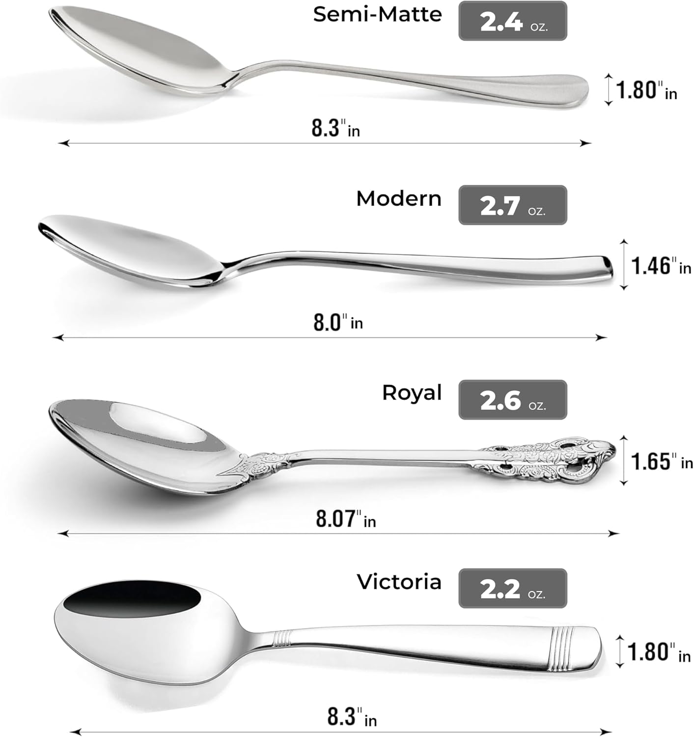 • Included Components : 8 dessert forks, 8 dessert spoons, 8 dinner forks, 8 dinner knives, 8 dinner spoons