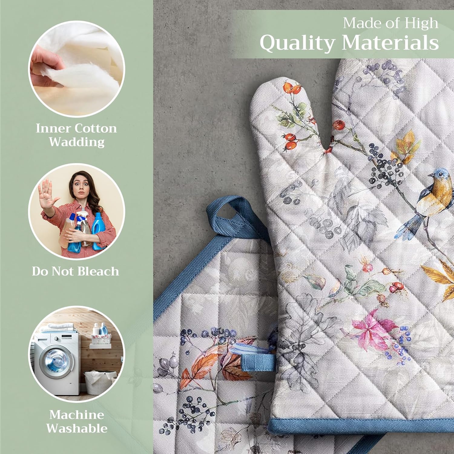 • Premium Quality: Crafted from quilted 100% cotton, this heat-resistant oven mitt and pot holder set protects your hands from hot cookware. Each piece features a built-in hanging loop for easy storage and quick access. This versatile set is perfect for everyday home kitchens, farmhouse kitchens, hotels, restaurants, and bakeries