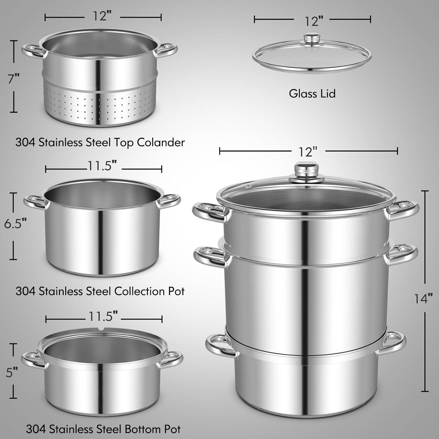• 🍒[Durable Stainless Steel Material]- Our fruit or vegetable juicer steamer is made of durable and long-lasting stainless steel which is clean and sanitary to ensure healthy and long-term use. Handles are all crafted of high quality stainless steel which is firmly welded on the steamer and brings you much convenience to hold and transport the juicer steamer.