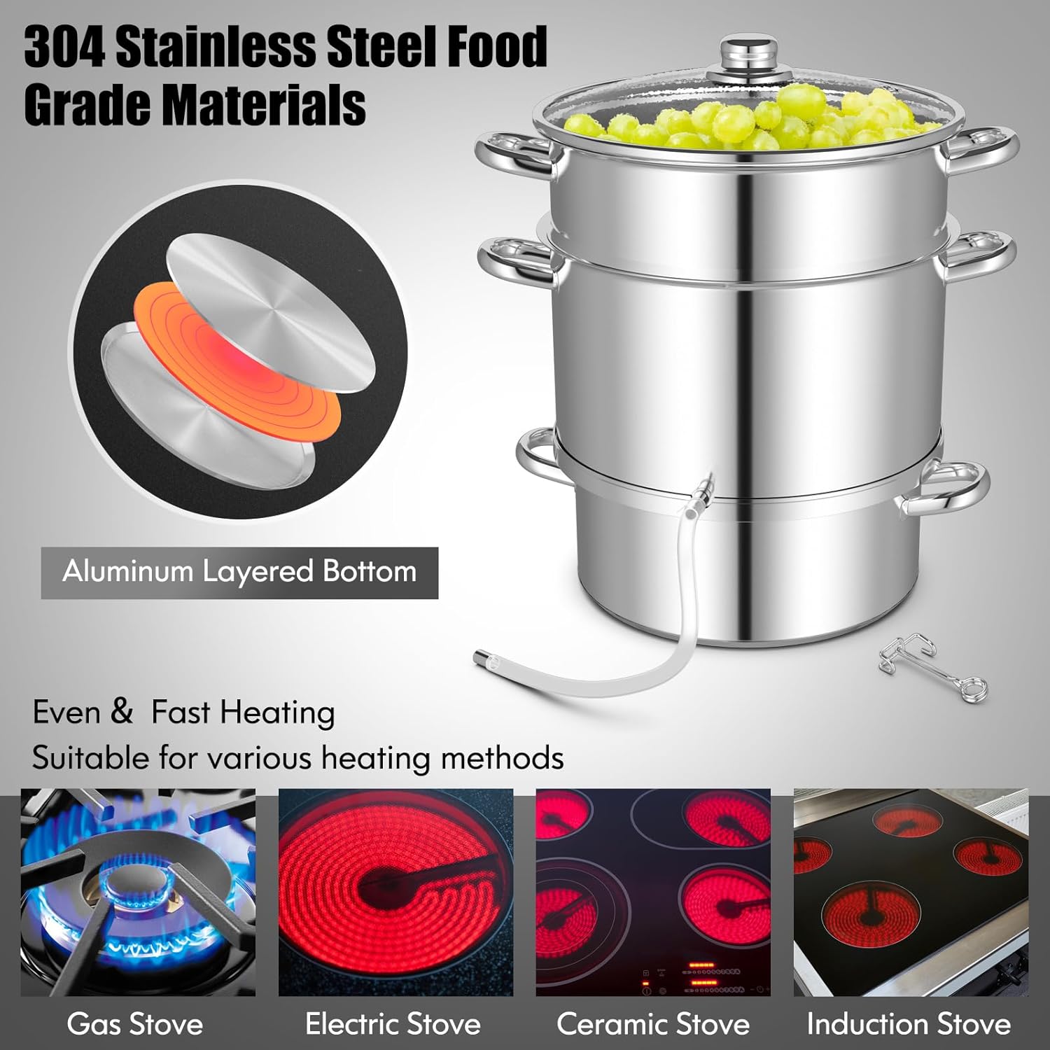 • 🍈[Powerful Capacity]- This juicer steamer can be used on any range. The stock pot can hold up to 11 quarts fruits or vegetables. Its flat aluminum-clad bottom for even heating is suitable for any cooktop including induction cooker.