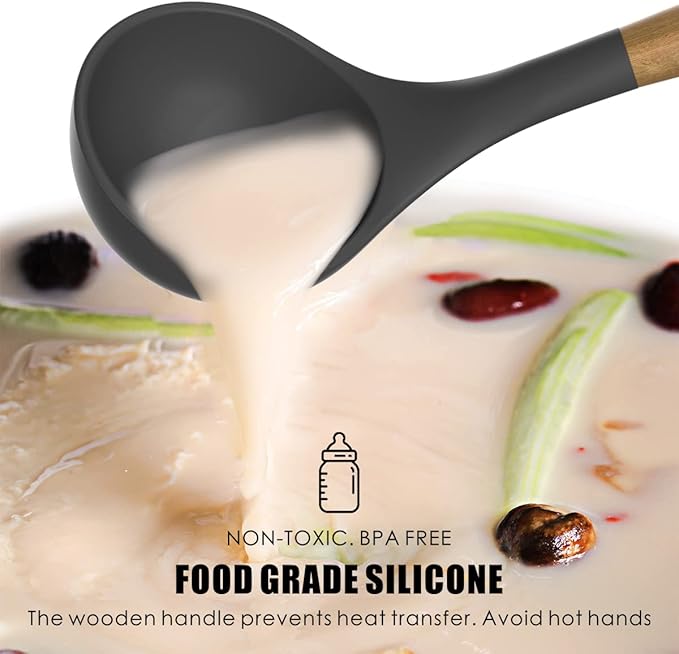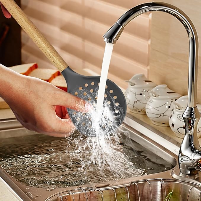 • HEAT RESISTANT & DURABLE: Our silicone kitchen utensils set features upgraded thickened silicone, enhancing durability and elasticity for a smoother cooking experience. Withstands up to 446°F (230°C) without melting or warping, retaining shape even after frequent use. Soft, thick heads protect cookware from scratches, suitable for nonstick pans and daily high-heat cooking