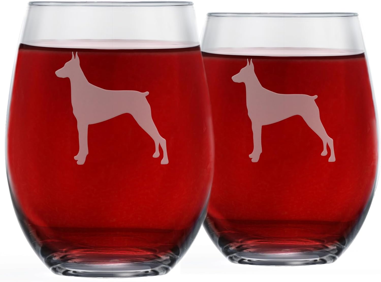 • Celebrate your favorite dog breed - Proud Doberman parents, these glasses are for you! Each stemless glass has 2 etched silhouettes of an adult Doberman on the outside, and the special breed name etched into the bottom. Comes in a set of 2 for sharing!