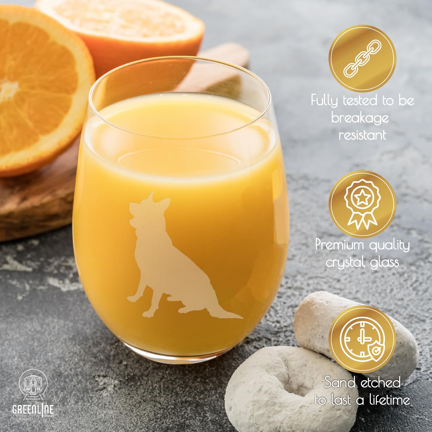 German Shepherd Stemless Wine Glasses (Set of 2) | Unique Gift for Dog Lovers | Hand Etched with Breed Name on Bottom