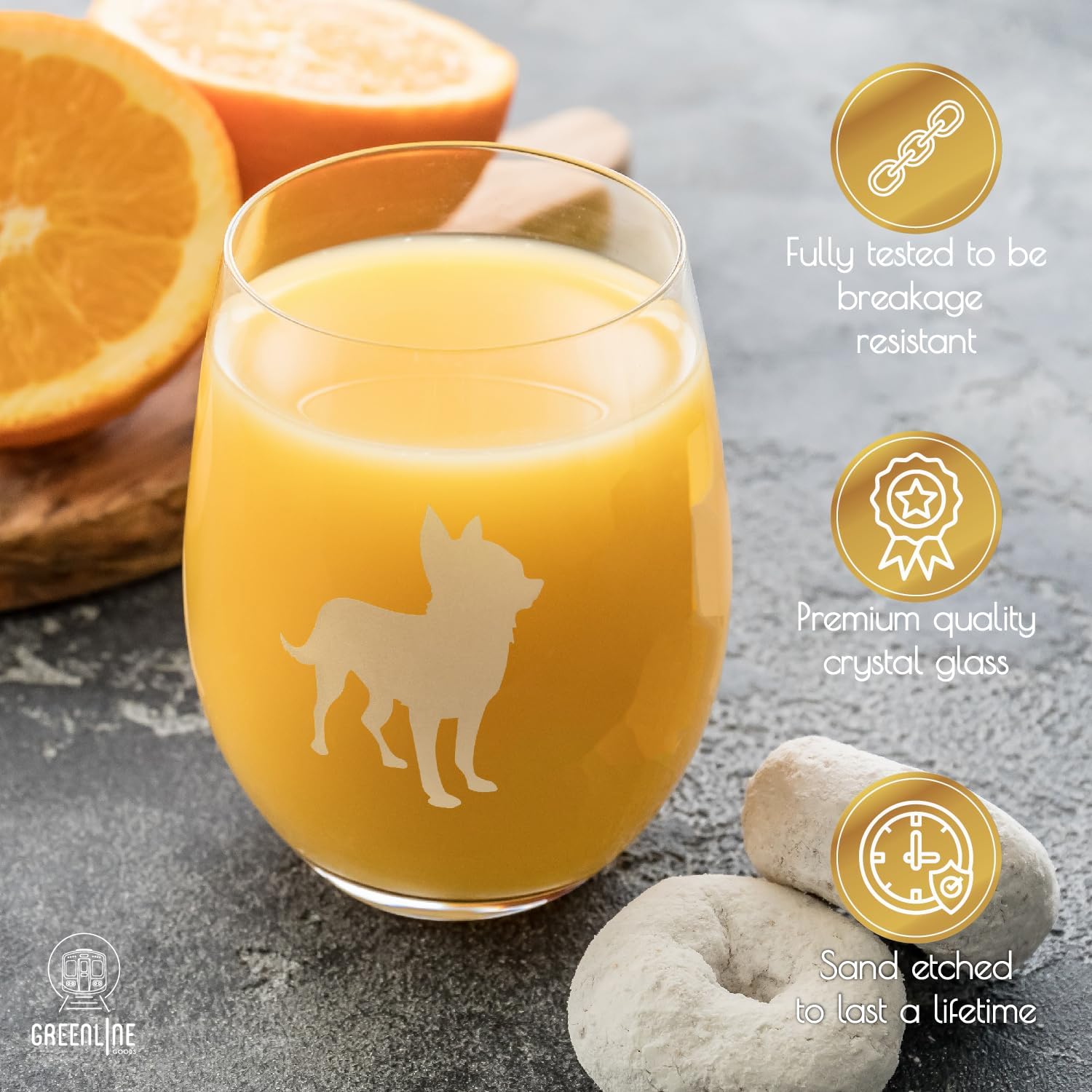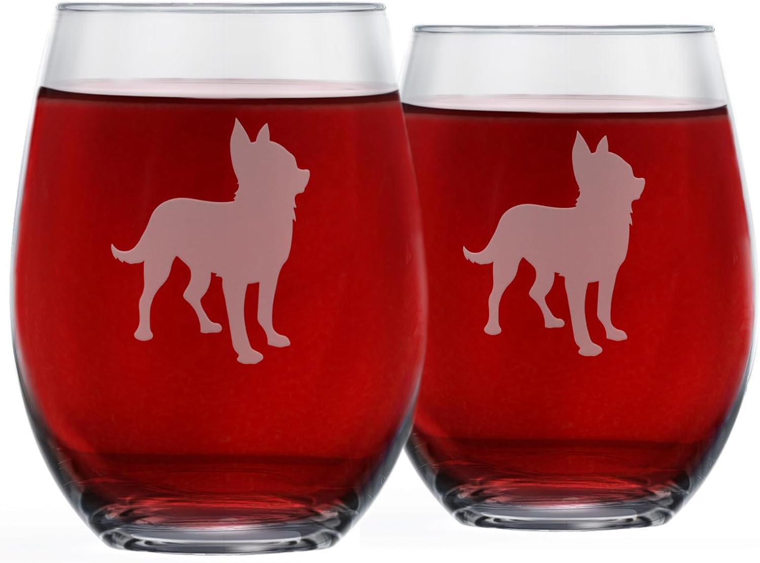 • Celebrate your favorite dog breed - Proud Chihuahua parents, these glasses are for you! Each stemless glass has 2 etched silhouettes of an adult Chihuahua on the outside, and the special breed name etched into the bottom. Comes in a set of 2 for sharing!