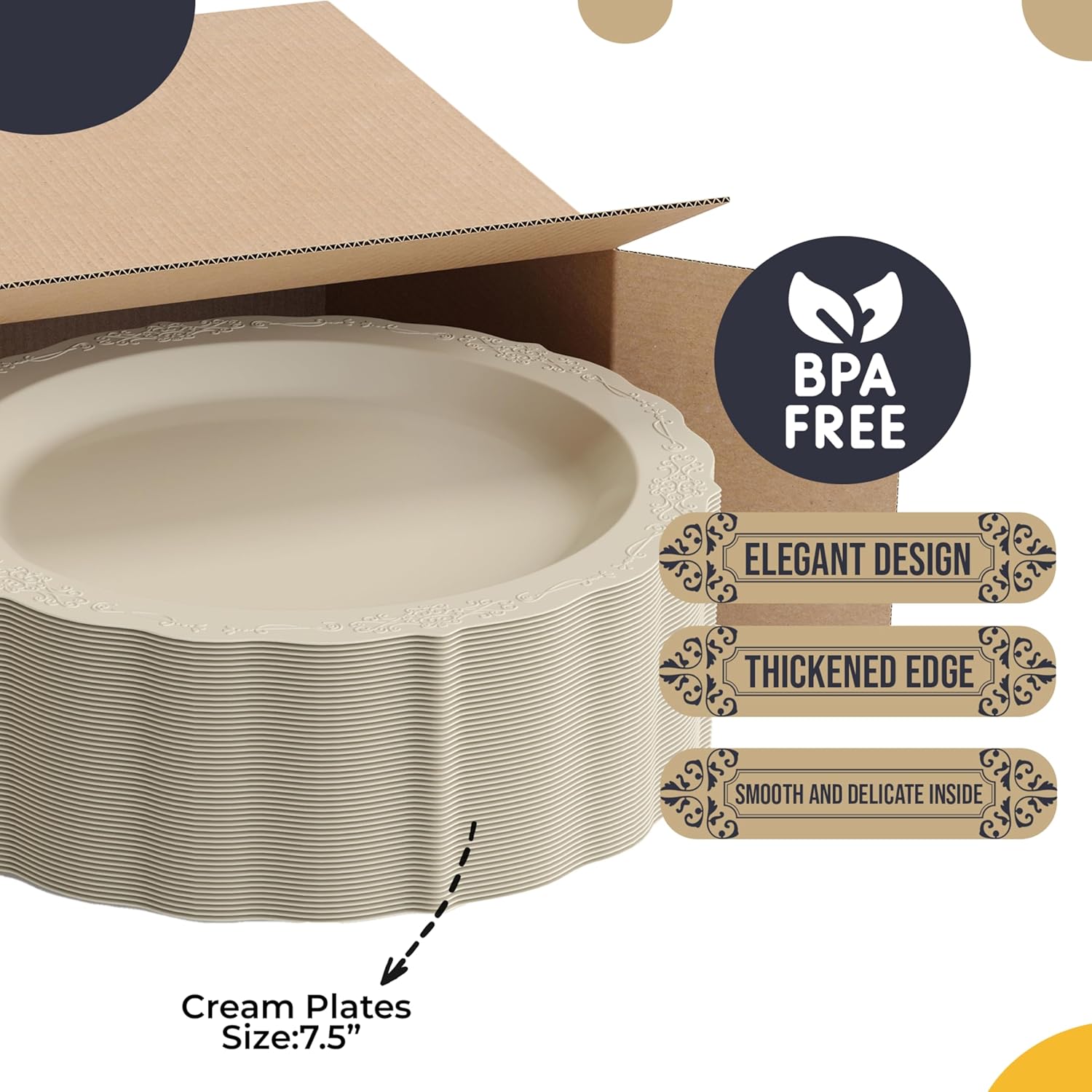 Exquisite Victorian 60-Piece Plastic Disposable Dinnerware Set - 60 x 7.5 inch Cream Plates for Party of 60 Guests