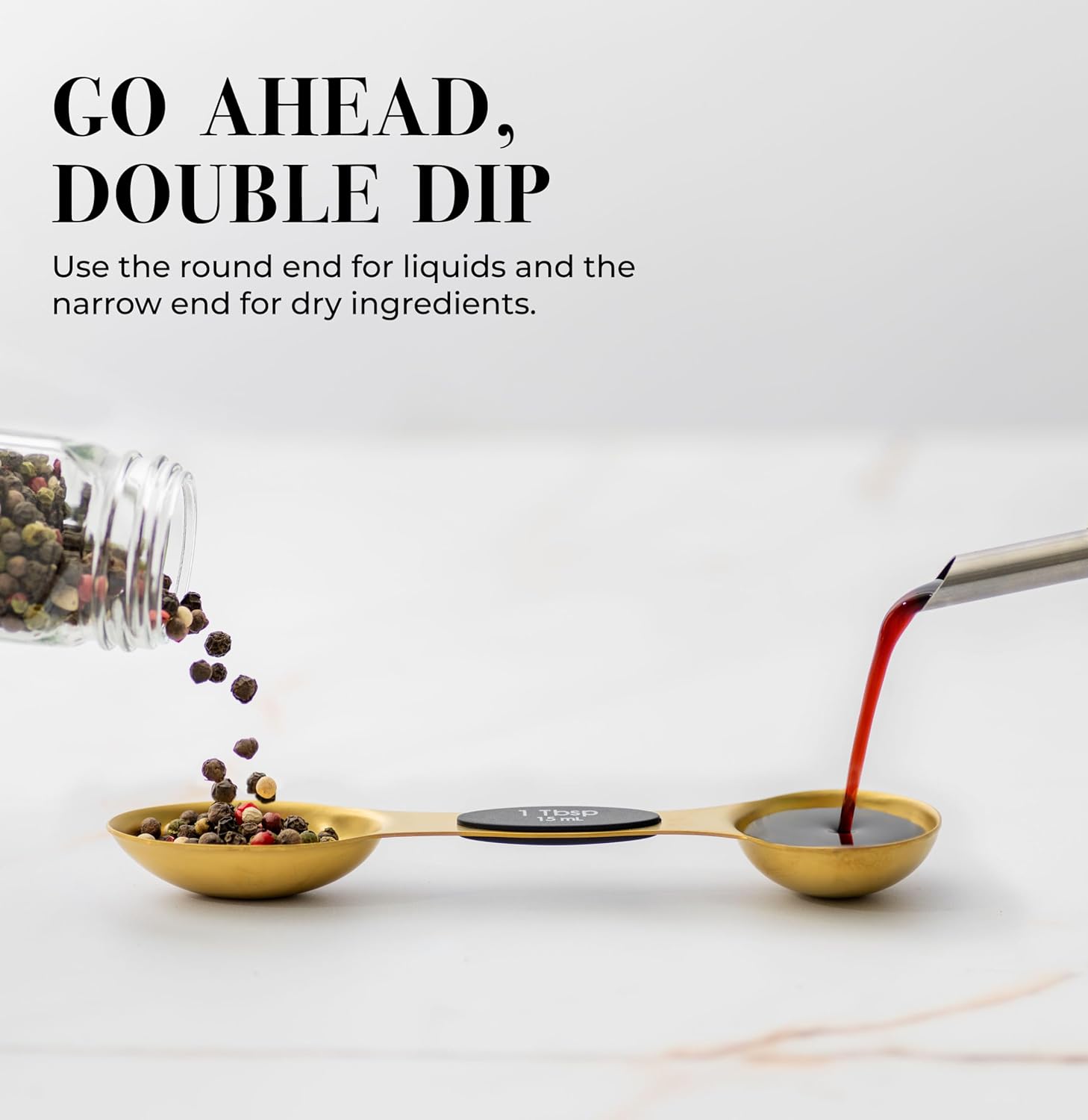 • SAVOR YOUR COOKING AND BAKING WITH THIS EASY TO USE GOLD MEASURING SPOONS SET – unique dual-ended measurement spoons accommodates both dry and wet ingredients with ease and comfortably lays flat on countertops; use the small oval end for narrower openings such as spice jars or baking soda tins instead of pouring messily into a spoon, and use the round end for liquids such as oils or extracts; magnetic spoons are a practical, convenient baking essential to level up in the kitchen.
