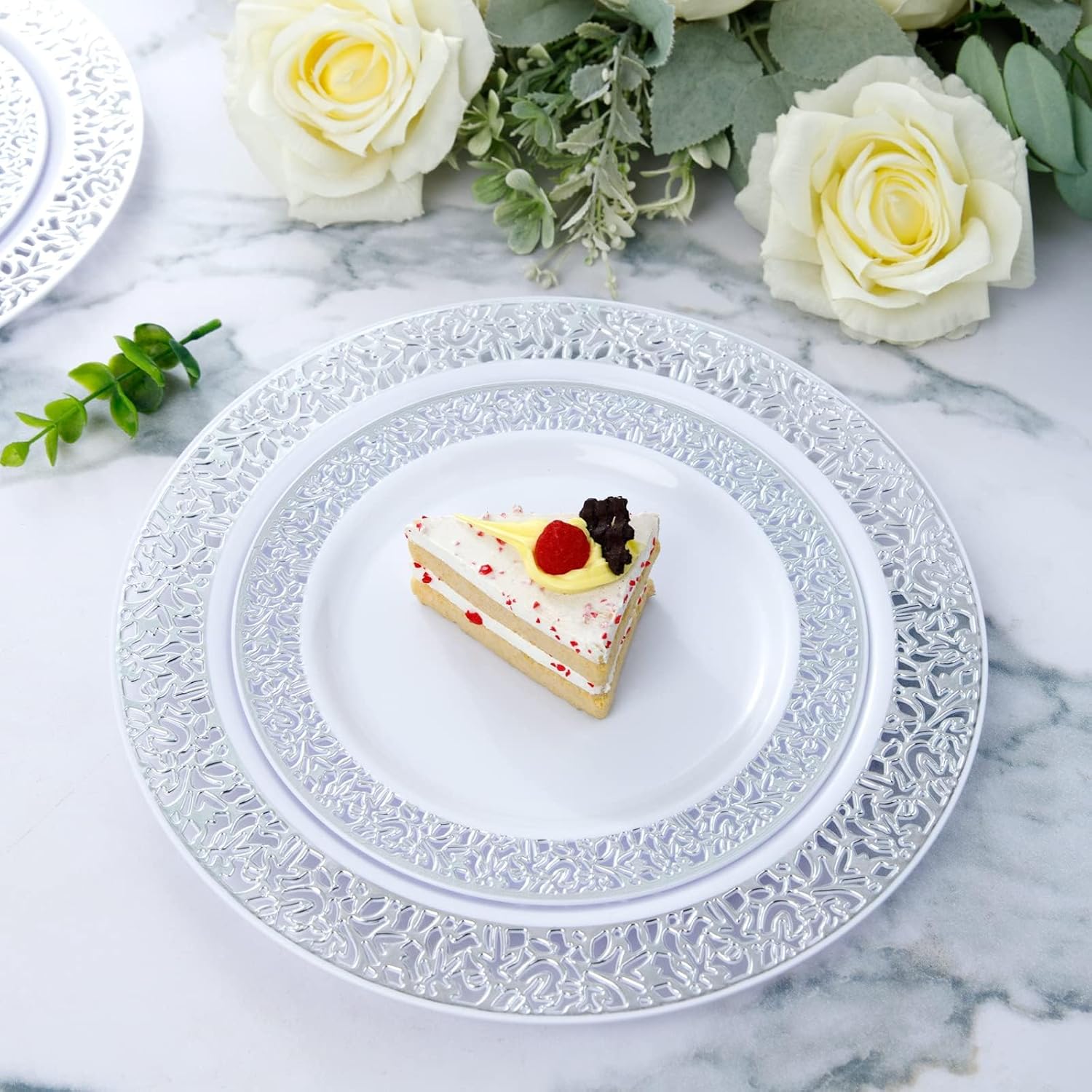 • ELEGANT DESIGN: Modern and lace plastic disposable plates designed to give your table settings an amazing and gorgeous look. Our 25 Dinner Plates, 25 Salad Plates, 25 Forks, 25 Knives, 25 Spoons, 25 Plastic Cups, Idea for 25 guests, sturdy construction resists breakage, bending.