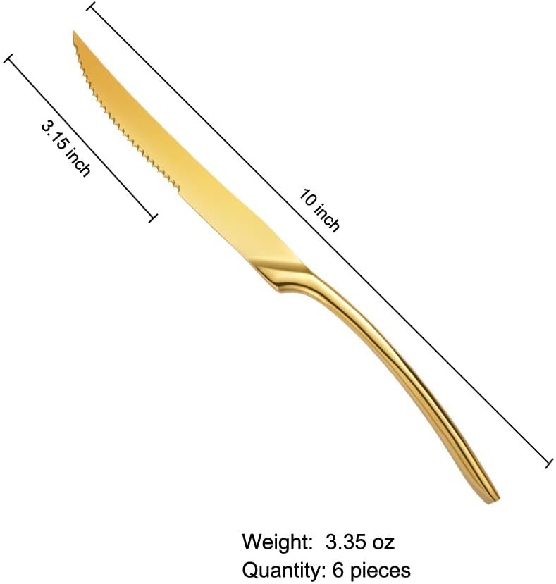 Lemeya Stainless Steel Gold Steak Knives Set of 6,Forge Steak Knife,Serrated Steak Knives Set,6 Piece Heavy Steak Knives-10 inch,Mirror Polished,Dishwasher Safe