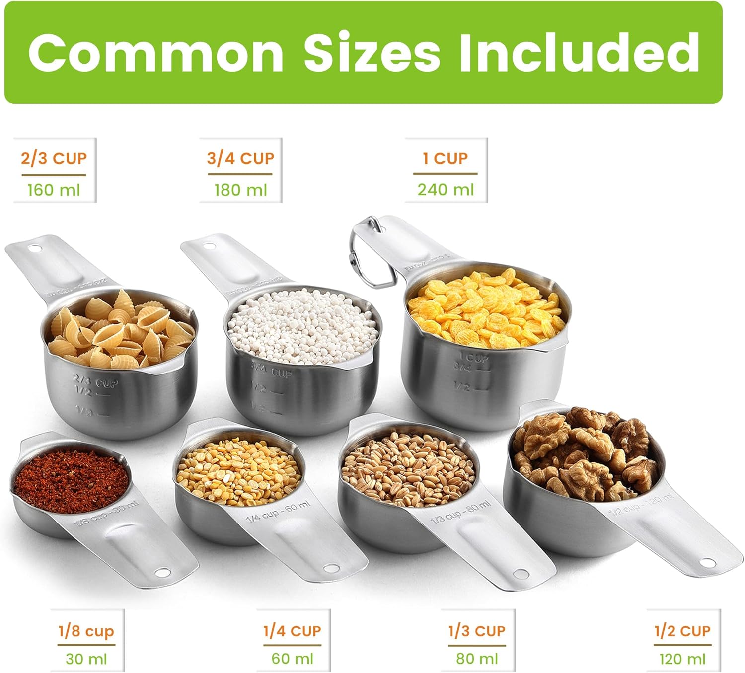 • Complete Set Of Kitchen Measuring Cups With All The Common Sizes You Need - You'll be able to make almost anything with the included sizes - 1/8 cup, 1/4 cup, 1/3 cup, 1/2 cup, 2/3 cup, 3/4 cup, and 1 cup plus a ring. You won't realize how useful they are until you have them.