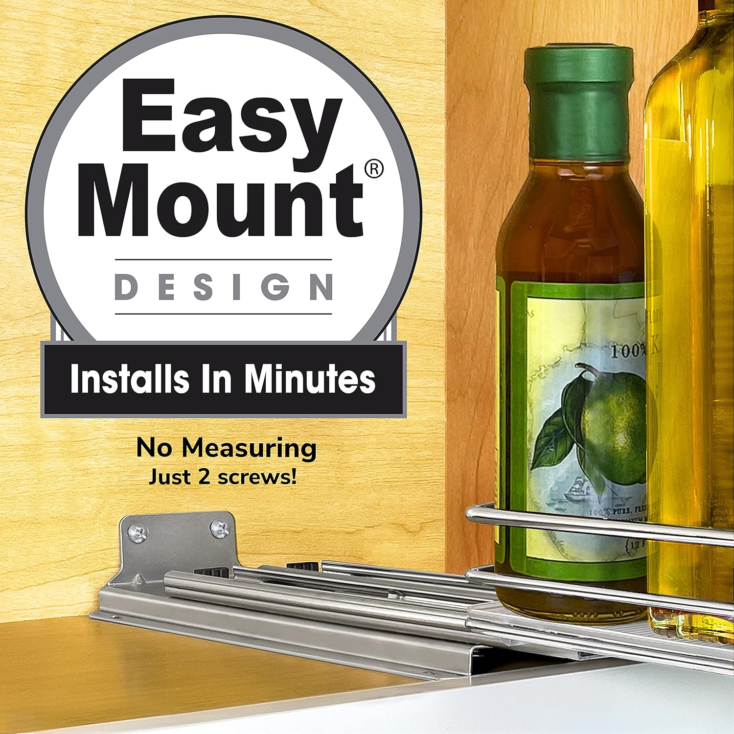 • SETUP IS A BREEZE! – no struggling within limited space trying to place four awkward and difficult to reach screws inside your upper cabinets or into pantry shelves – our exclusive EASY MOUNT cabinet friendly drawer design installs with just two screws in the easily accessible back of your narrow cabinets – in minutes with no measuring!