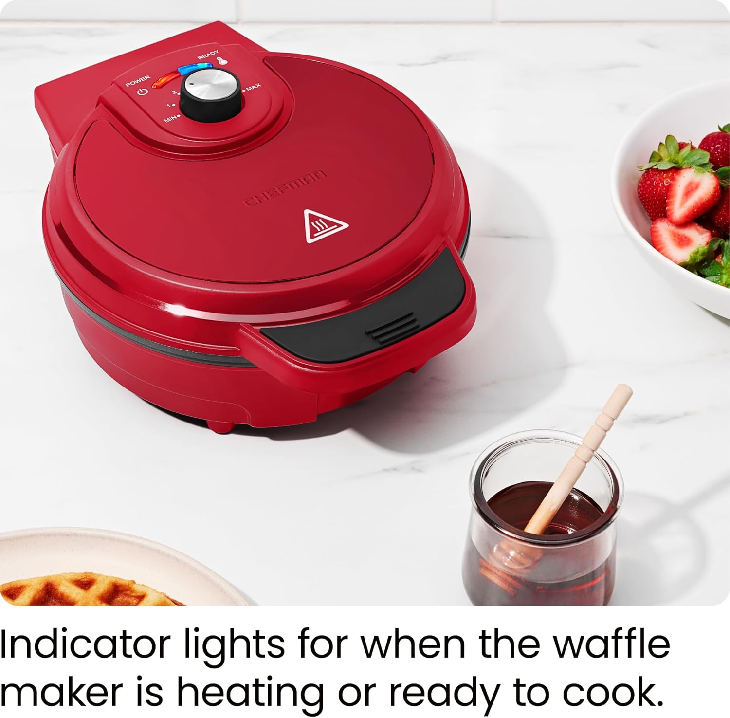 Chefman Anti-Overflow Belgian Waffle Maker w/Shade Selector, Temperature Control Mess Free Moat, Round Iron w/Nonstick Plates & Cool Touch Handle, Measuring Cup Included, Red