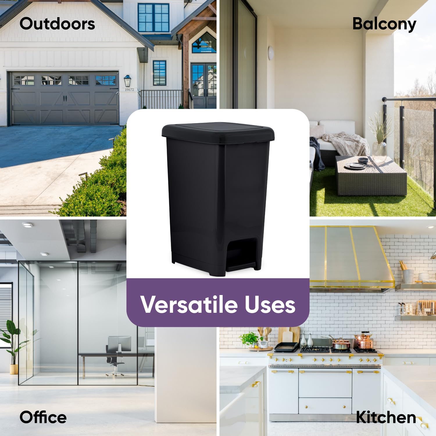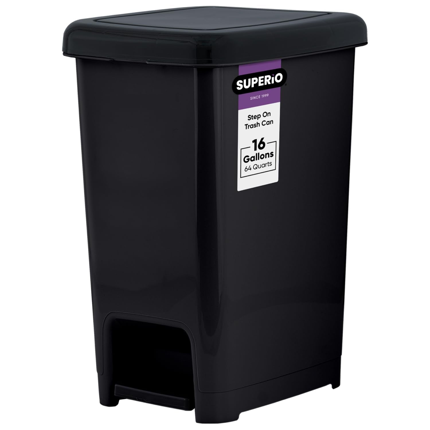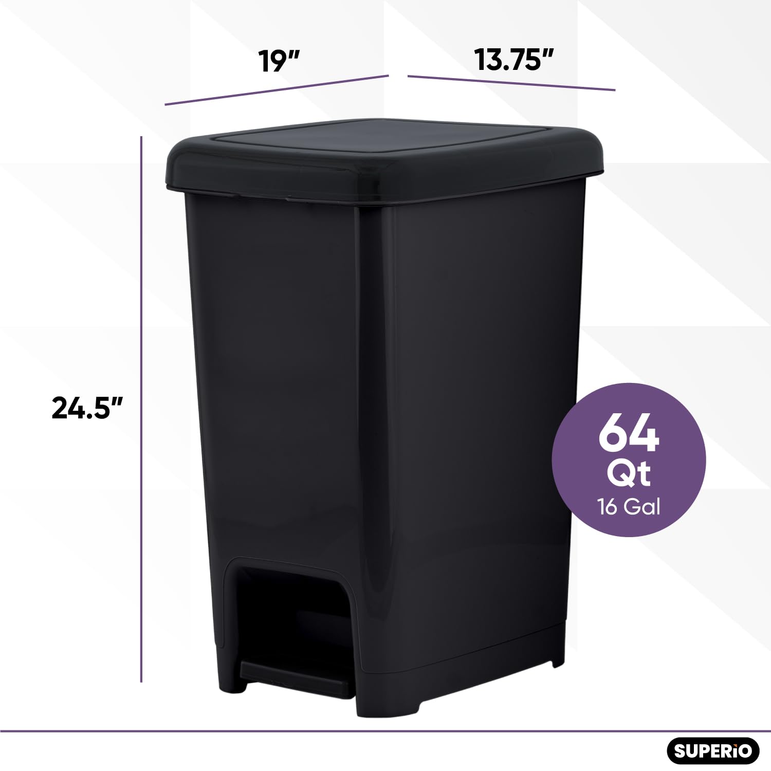 Superio Kitchen Trash Can, Slim Step On Garbage Can with Foot Pedal, 16 Gallon, 64 Qt. Large Black Heavy Duty Plastic Trash and Recycling Bin